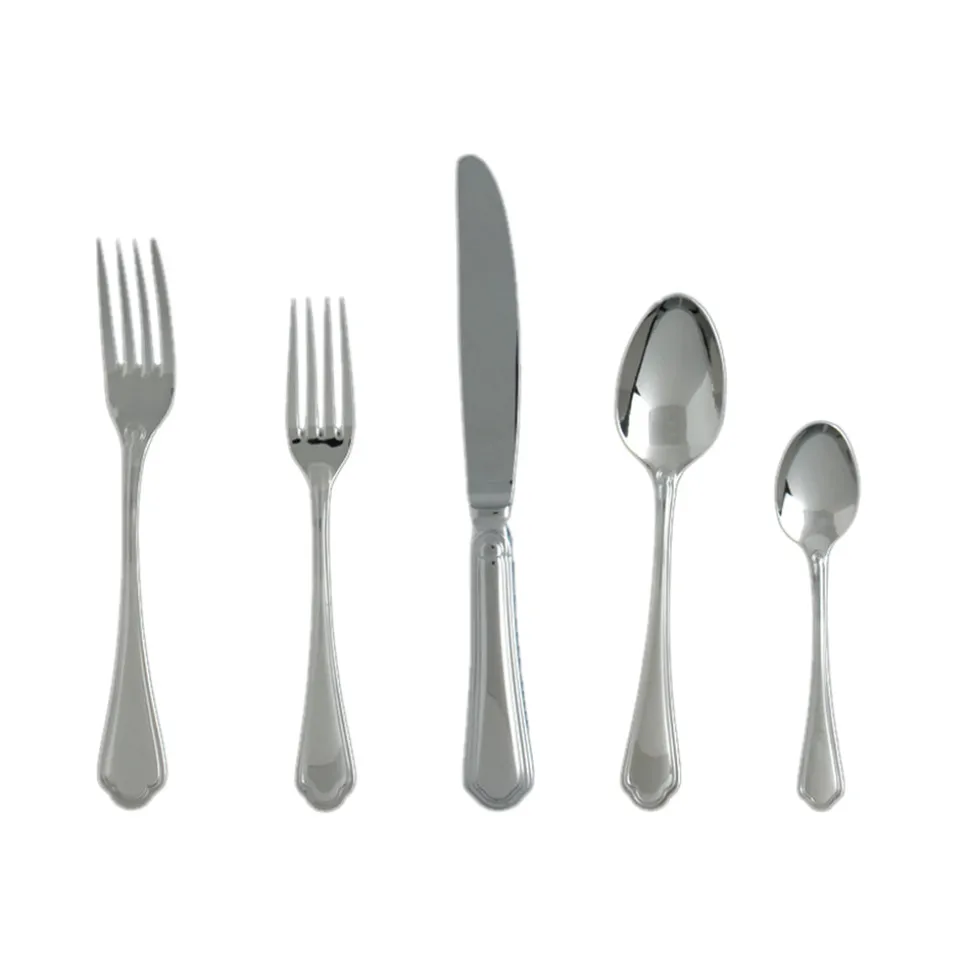 5 or 20 pieces. Stainless steel. Includes 1 or 4 of each: table fork, salad/dessert fork, table knife, dessert/soup spoon, coffee/ tea spoon.