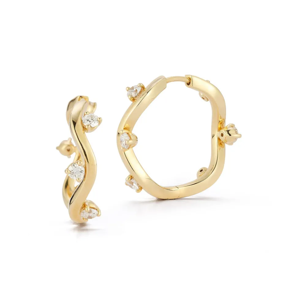 Inspired by her mother, who made golden jewelry from shells found near their home in Southern California, Renna Brown-Taher creates jewels of exquisite quality from the natural world, with minimal impact upon it. The Medium Constellation Hoops feature a wavy hoop shape accented with alternating diamond stones, creating a star-like effect. Secured with a click closure, these earrings will add a sophisticated sparkle to any outfit.