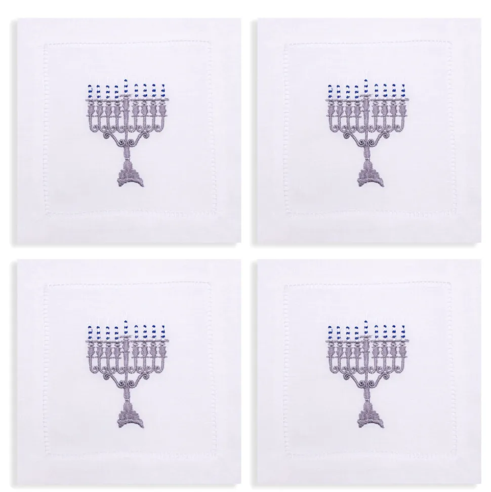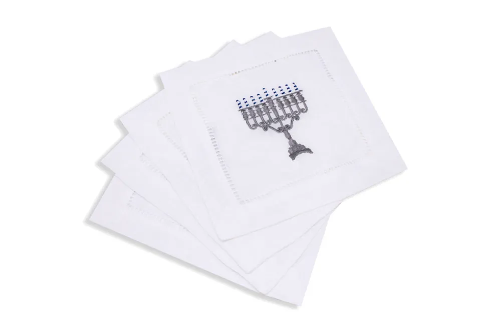 Founded by New York-based caterer, culinary influencer, and designer Stephanie Nass, Chefanie dinnerware brings people together over food and art. The culinary-driven lifestyle brand specializes in fanciful designs from tableware to home accessories. This set of cocktail napkins features an embroidered menorah on white linen with a hemstitch border, a beautiful addition to your Chanukah celebrations.