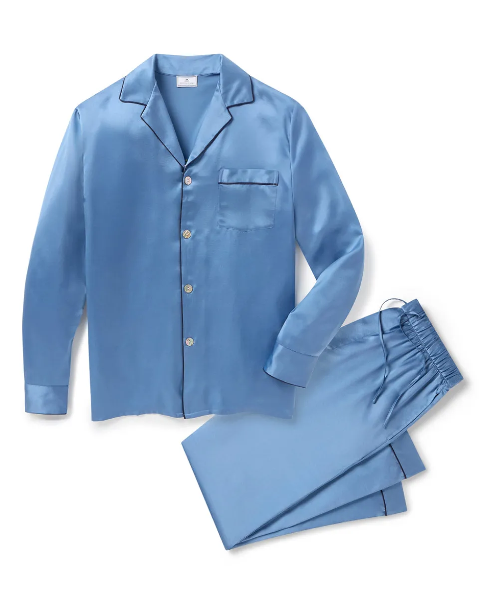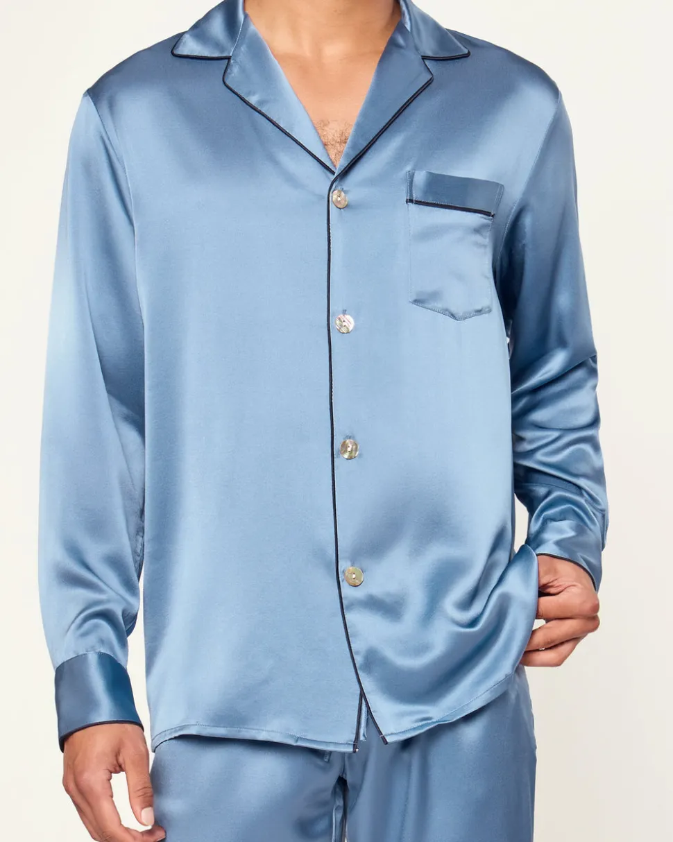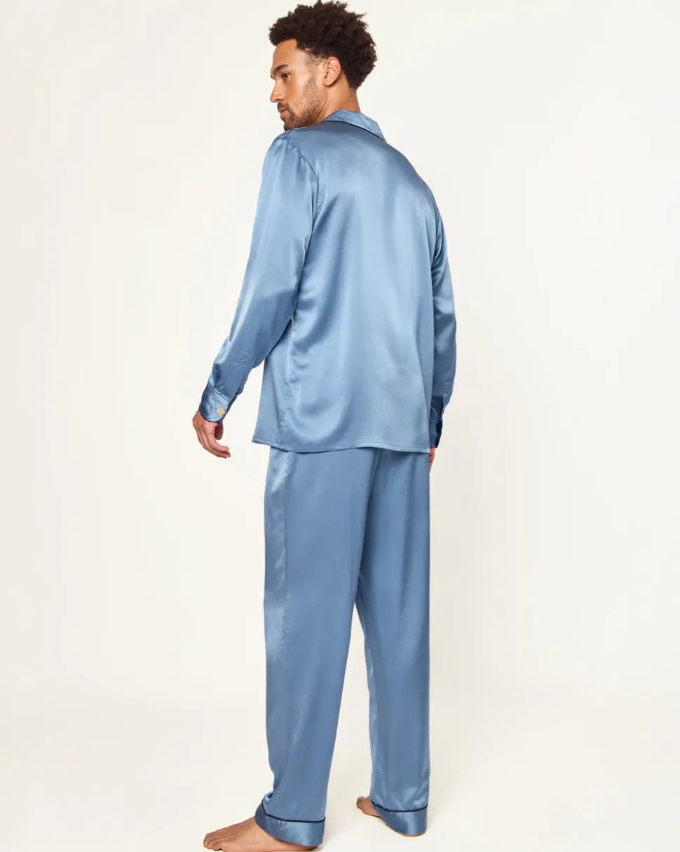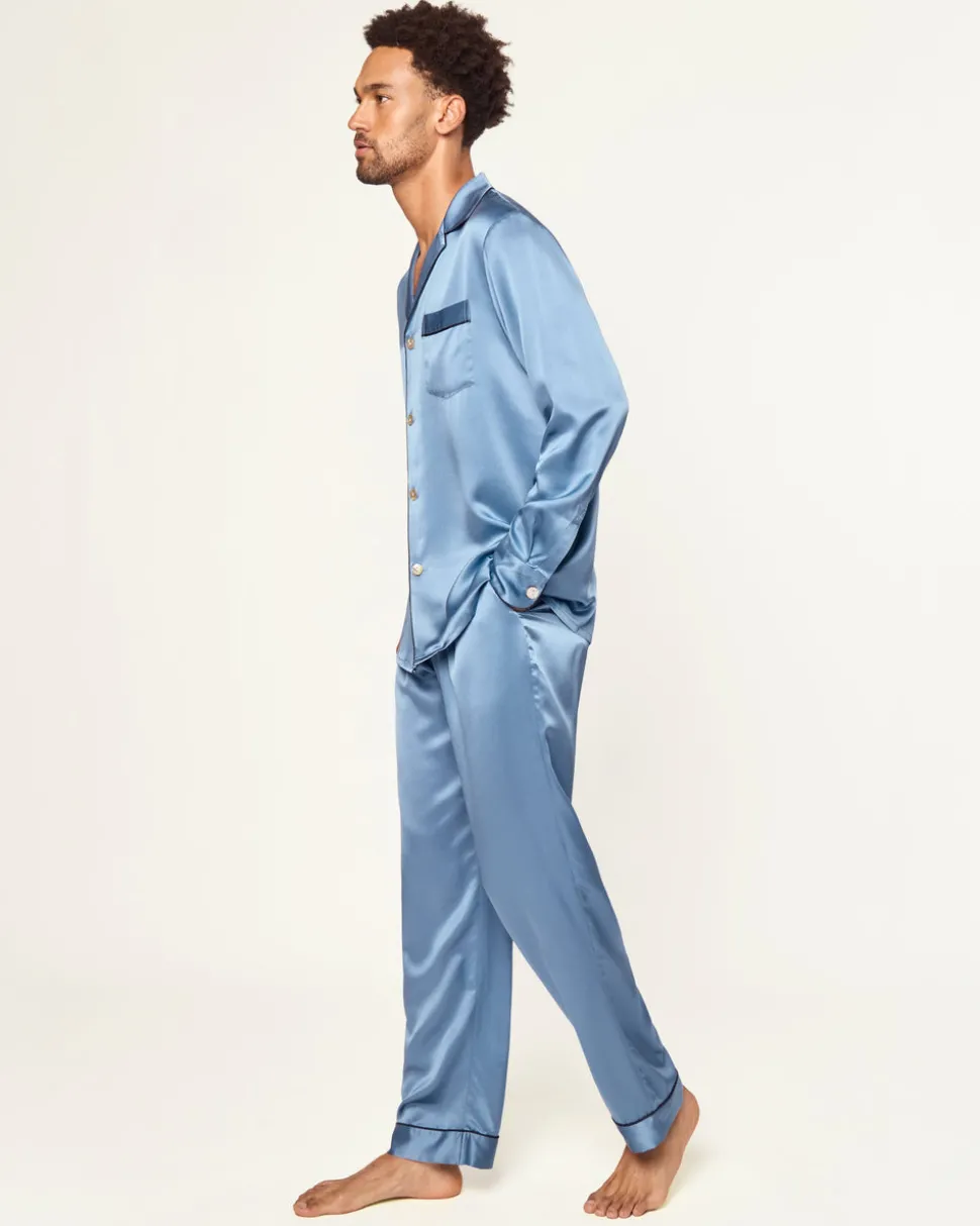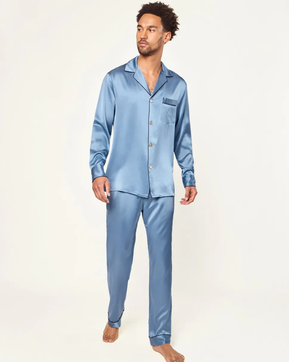 Petite Plume wishes you a “bonne nuit,” and in their luxury sleepwear, it’s hard not to oblige. The Men’s Silk Pajama Set in Mystique Blue is rendered in a timeless, elegant shade of lustrous mulberry silk—ideal for crisp autumn days, festive holiday evenings, and beyond. A quintessential silhouette designed for effortless sophistication, this set is refined enough for hosting at home and comfortable enough for nights spent dreaming.