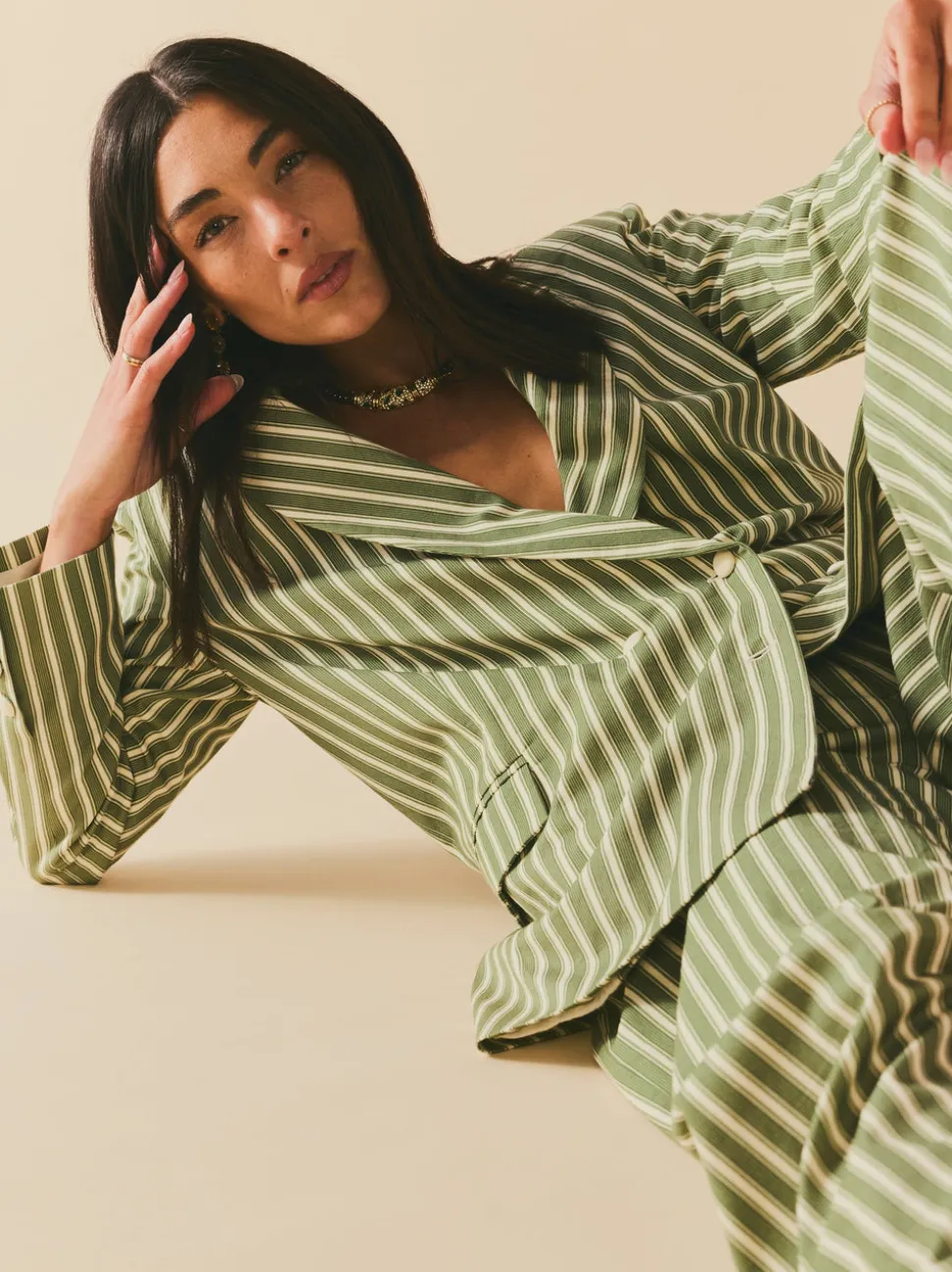 100% BCI cotton twill. Double-breasted front. Green and white striped pattern. Oversized tailored silhouette. Two front pockets. Made in India.