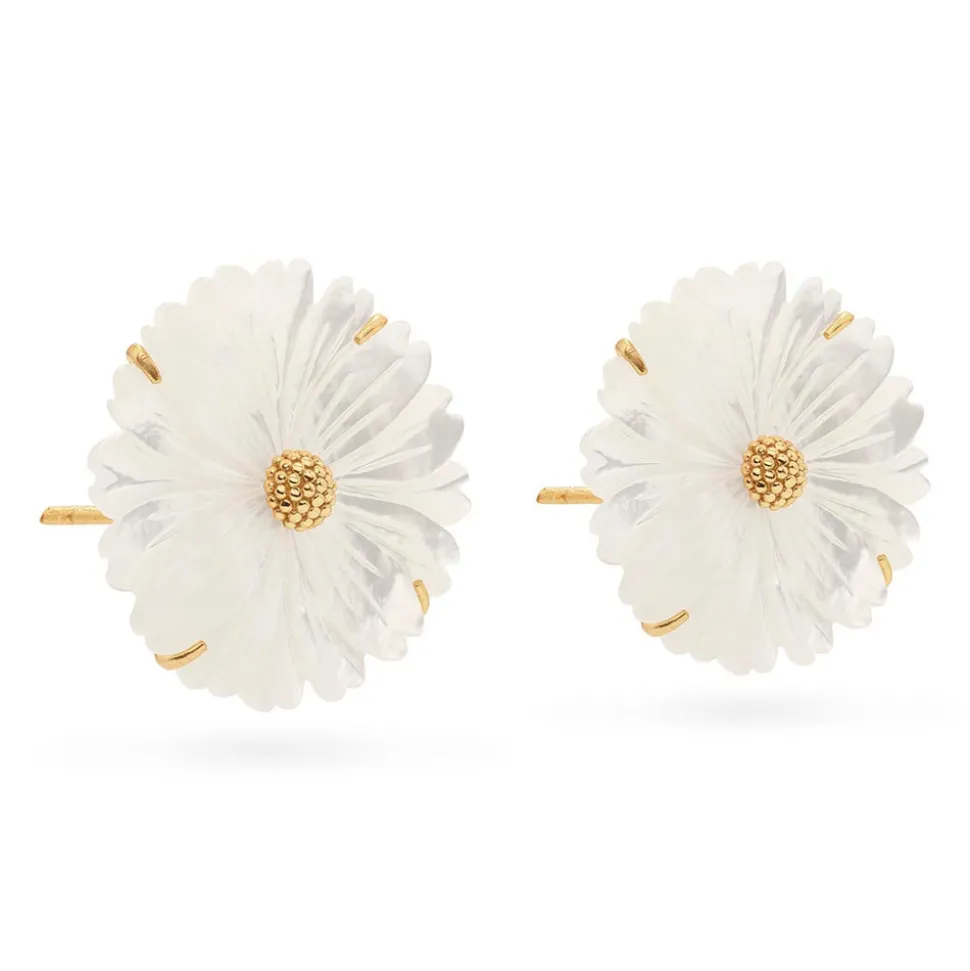 Half-Parisian, half-Texan, Capucine De Wulf’s unique upbringing was the inspiration for her namesake jewelry line. Her accessories combine French romance with an American sensibility. The boldly feminine and botanic beauty of these statement earrings are balanced by the light and airy iridescence of natural mother of pearl. A cascade of flower petals and leaves is accented with delightful pops of colorful jade stones that frame your face.