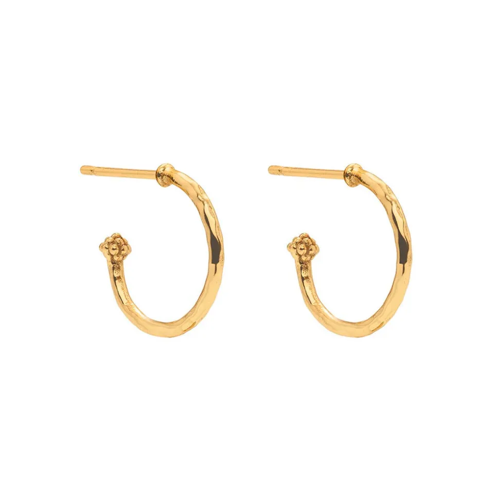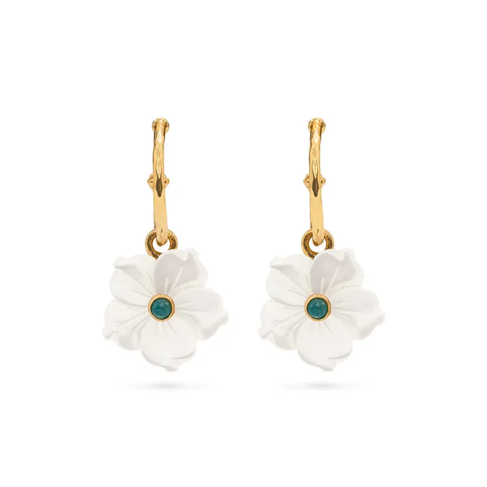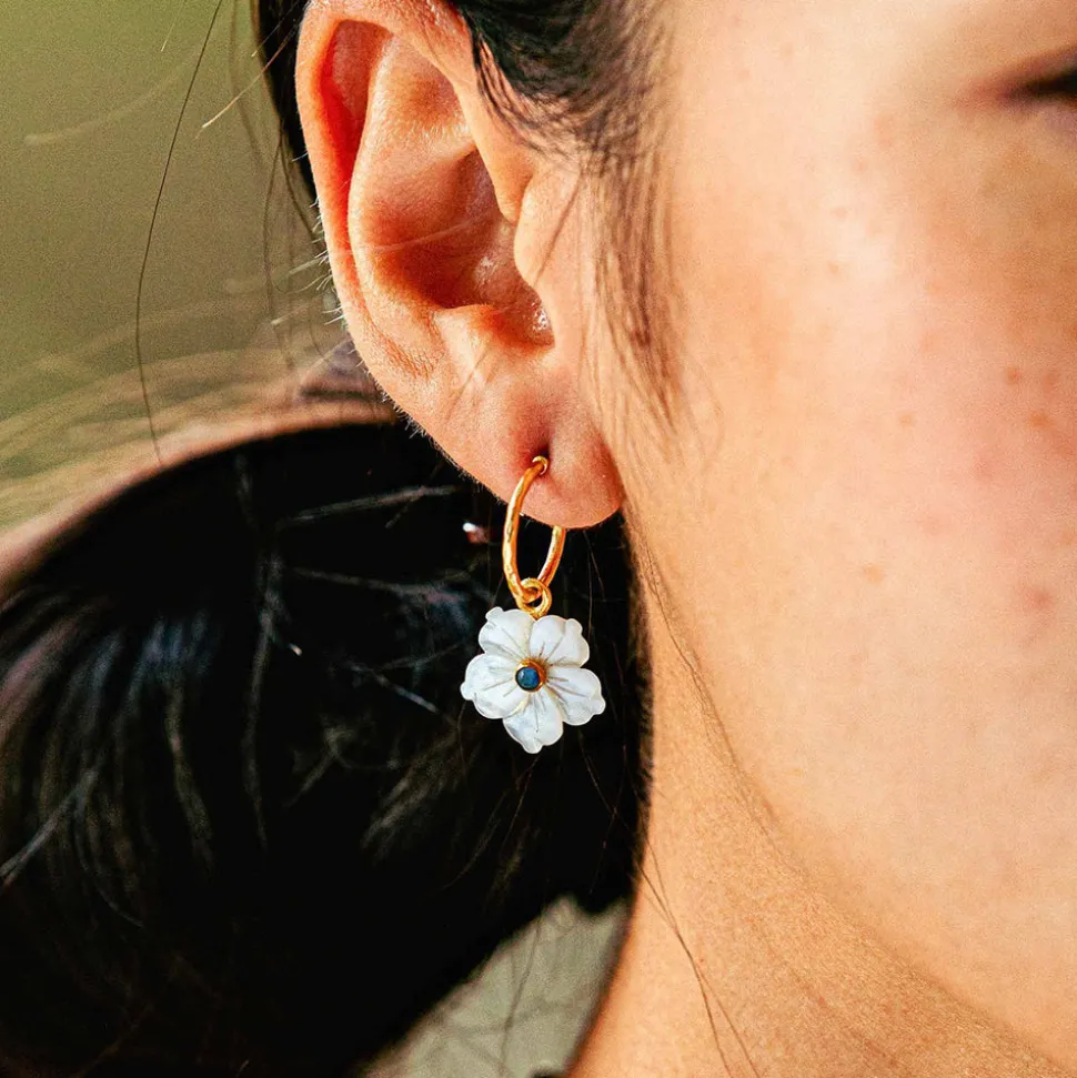 Half-Parisian, half-Texan, Capucine De Wulf’s unique upbringing was the inspiration for her namesake jewelry line. Her accessories combine French romance with an American sensibility. The exquisitely detailed mother of pearl flowers dangle sweetly from classic golden hoops that hug your ear for a subtle sway of movement as you go about your daily adventures. Dripping with iridescence and charm, these darling buds of spring dress up or down any outfit.