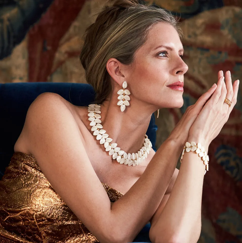 Half-Parisian, half-Texan, Capucine De Wulf’s unique upbringing was the inspiration for her namesake jewelry line. Her accessories combine French romance with an American sensibility. Hanging vines of hand-carved mother of pearl leaves with golden berry centers are divine for everything from weekend brunches to wedding parties and vacation escapes. Lush and polished, these botanical beauties cannot help but draw attention with their pearly luminescence.
