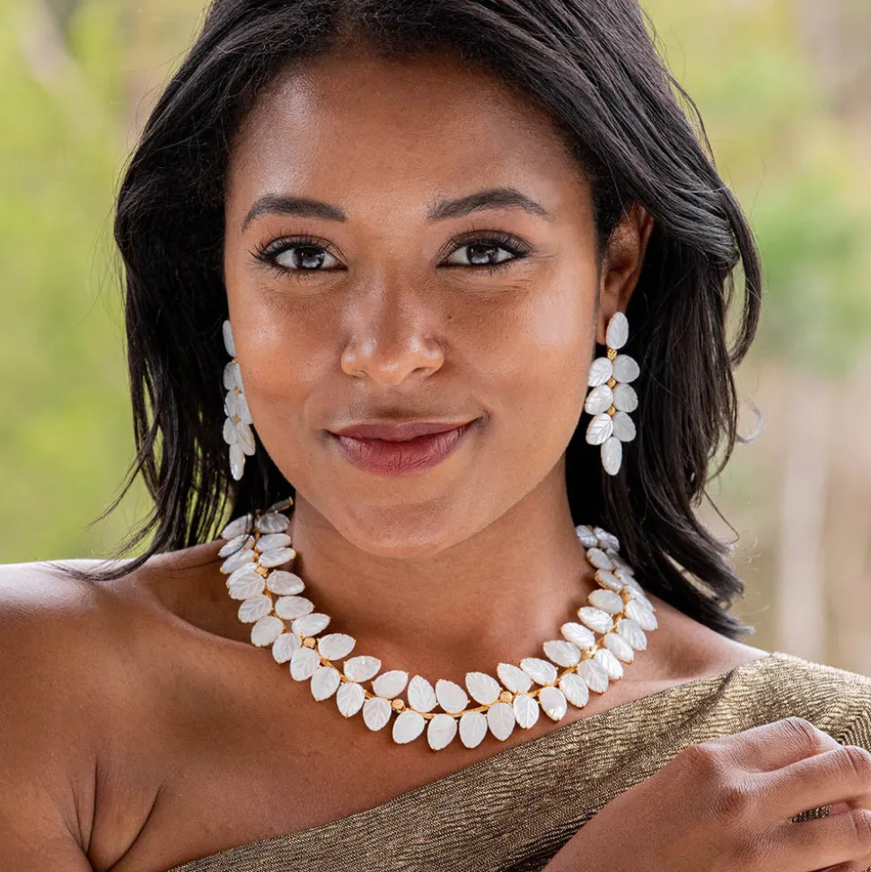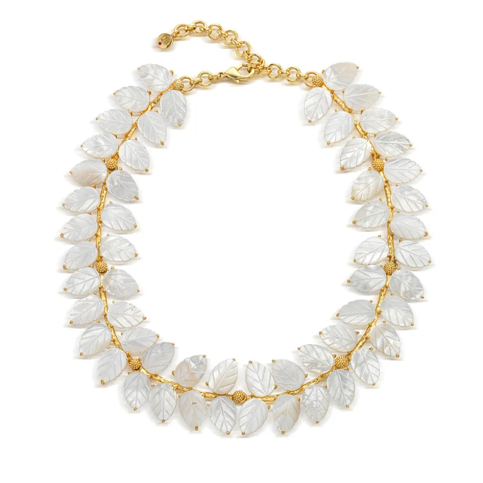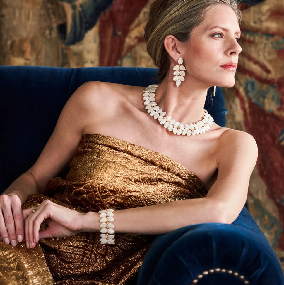 Half-Parisian, half-Texan, Capucine De Wulf’s unique upbringing was the inspiration for her namesake jewelry line. Her accessories combine French romance with an American sensibility. An opulent vine of hand-carved mother of pearl leaves makes a statement that is elegant and fresh, embellished with golden berries and gilded leaf tips.