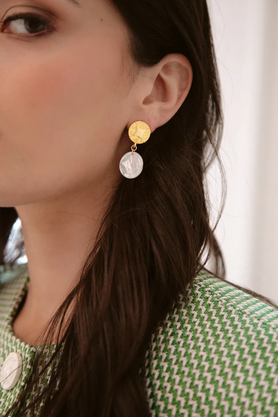 The mother-daughter duo behind Brinker + Eliza combine their experience in metalsmithing and fashion to create incredibly unique jewelry that feels custom-made. Employing pearls, shells, and earth’s most prized organic forms, these are pieces to be not just worn but treasured. The Meryl Earrings pair diamond-etched mother-of-pearl charms with 24k antique gold-plated etched discs, creating a refined balance of shimmer and texture. Featherweight and versatile, they transition effortlessly from a wedding celebration to a casual day look.