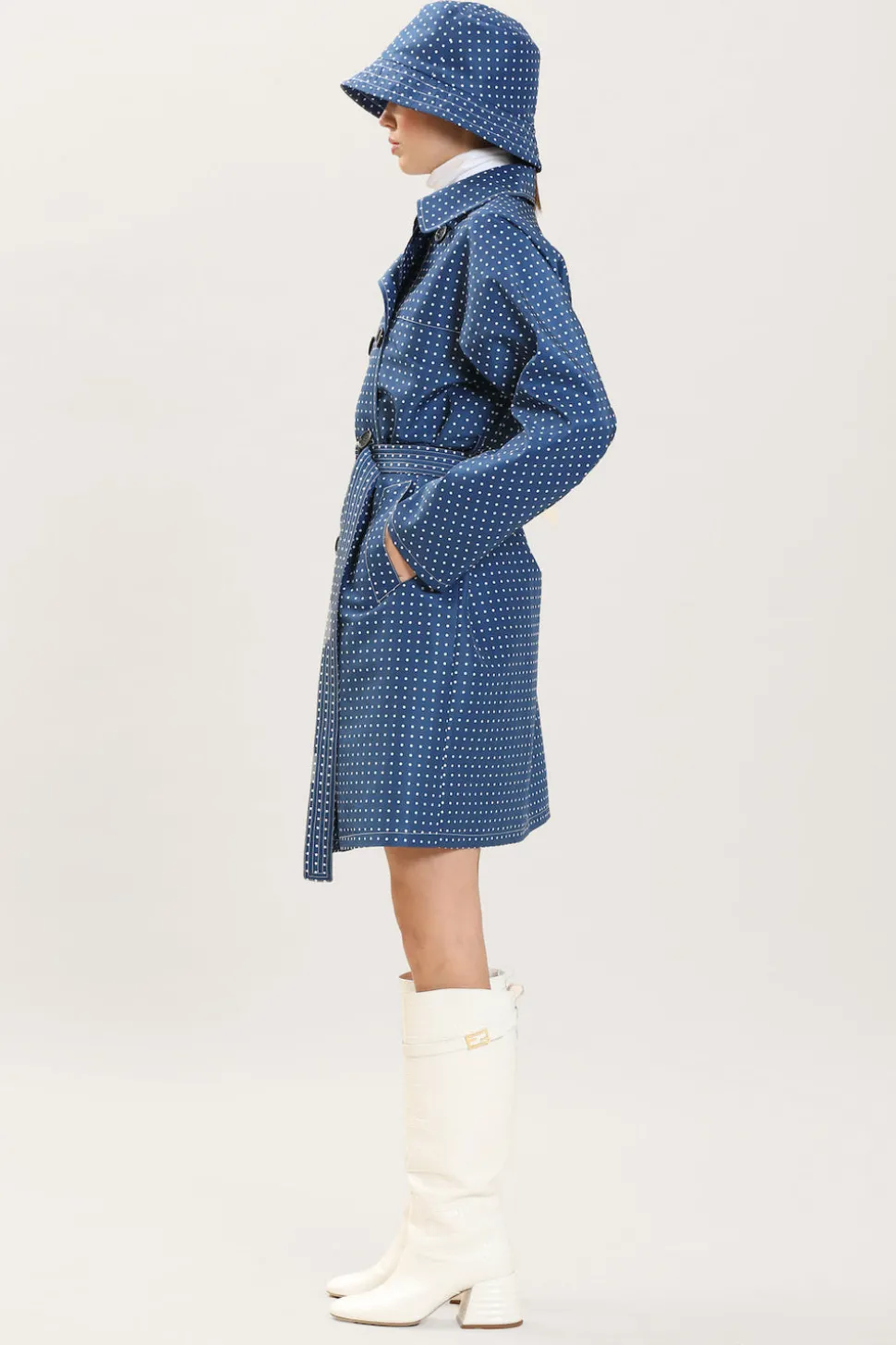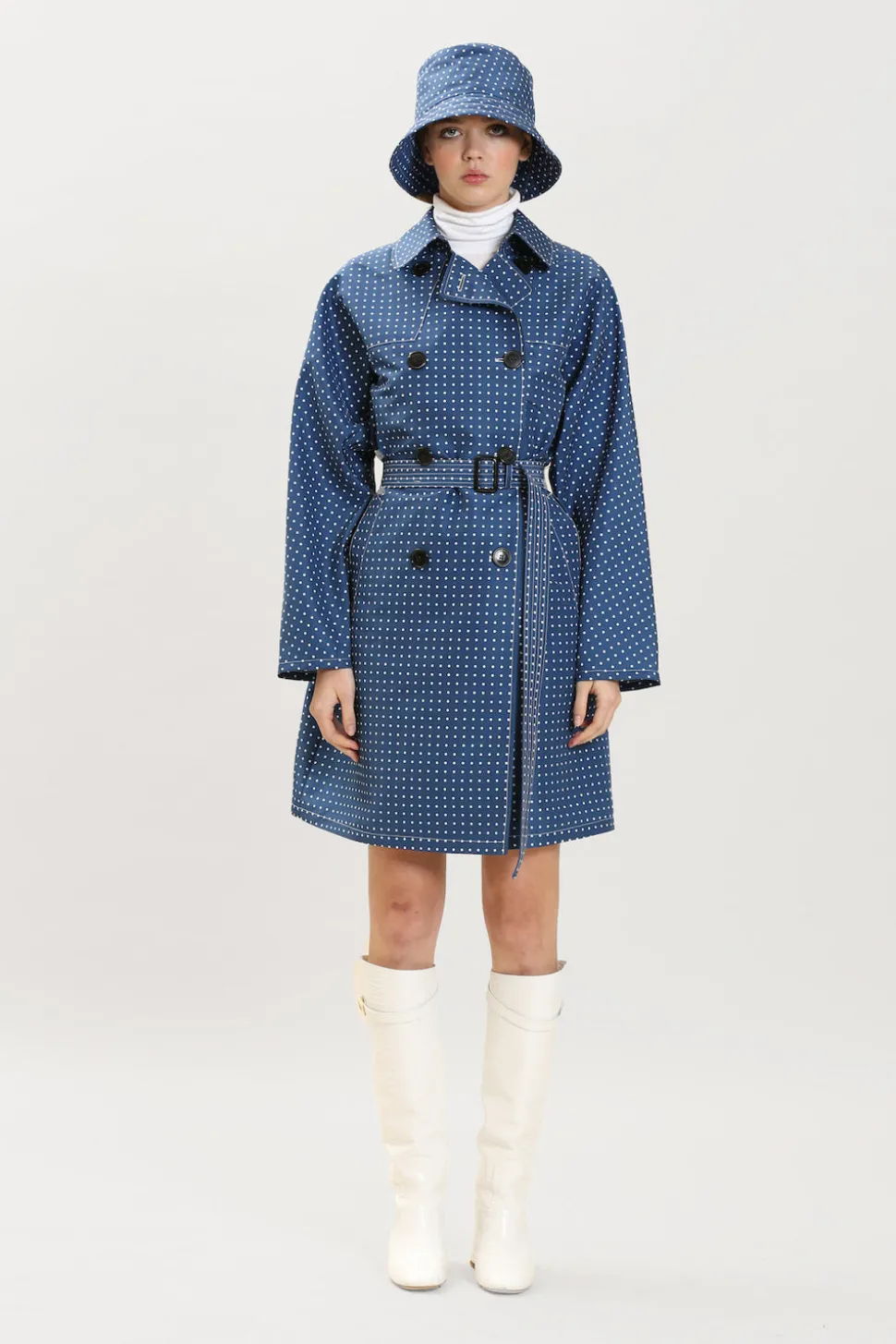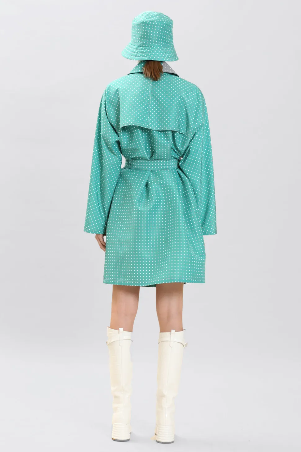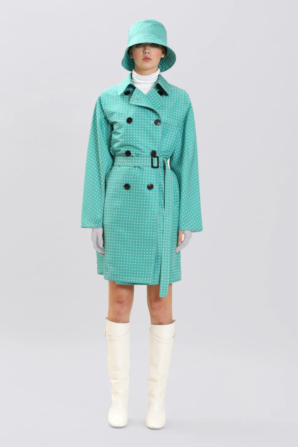 Delivering “unexpected luxury,” Maison Atia crafts exquisite outerwear with the highest quality faux fur. Designed by Chloé Mendel and Gustave Maisonrouge, each piece is imbued with the timeless quality only skilled artisans can create and applies recycled materials, upcycled fabric, and innovative practices to glamorous looks at the forefront of both style and sustainability. This raincoat takes their signature polka dots, normally found in their jackets’ lining, and brings it to the chic exterior of the Microdot Raincoat, and oversized double breasted trench.