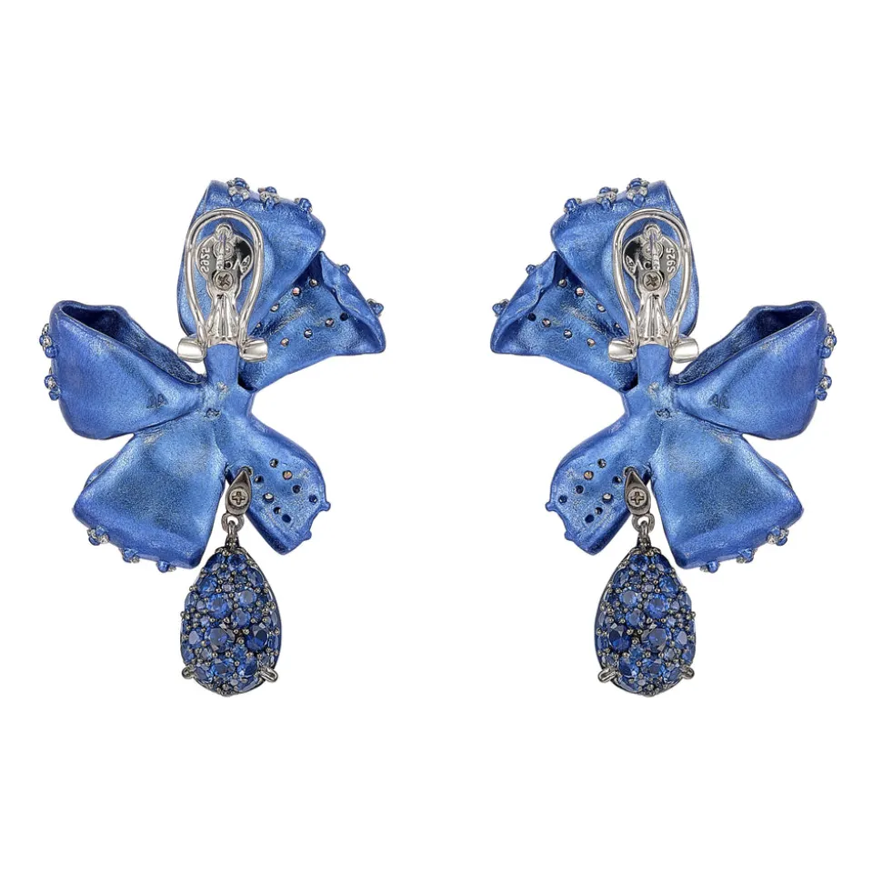 Laboratory-grown Kashmir blue sapphires (8.3 carats), and white diamonds.Omega backs in recycled royal blue aluminum, black rhodium vermeil with 14K gold posts. Handcrafted in the United Kingdom.