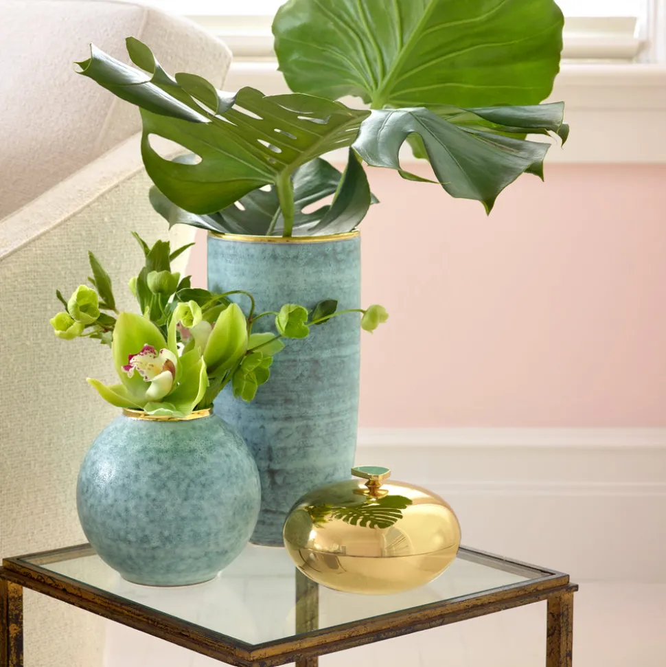 This attractive rounded brass vessel is topped by a beautiful lid enhanced with Aquamarine stone, inspired by the rich colors of European mosaic stone and tilework. The box adds interest wherever it is placed and has a multitude of uses, from holding pieces of jewelry on a vanity to serving candy or nuts.