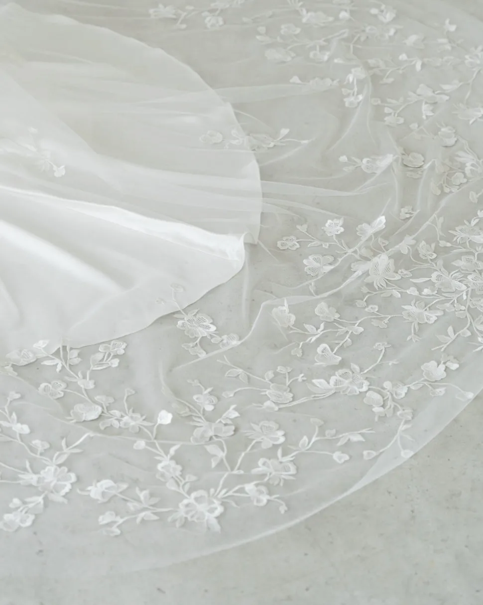 Famed for their comfort and wearability, Alexandra Grecco’s gowns and accessories find the balance between what is stylish and what is timeless. Handmade in New York’s garment district, these pieces embrace refinement and luxury from their graceful silhouettes to each immaculate detail. Lightly scattered floral embroidery, which pool into a heavily embroidered train, define the Minetta Veil.