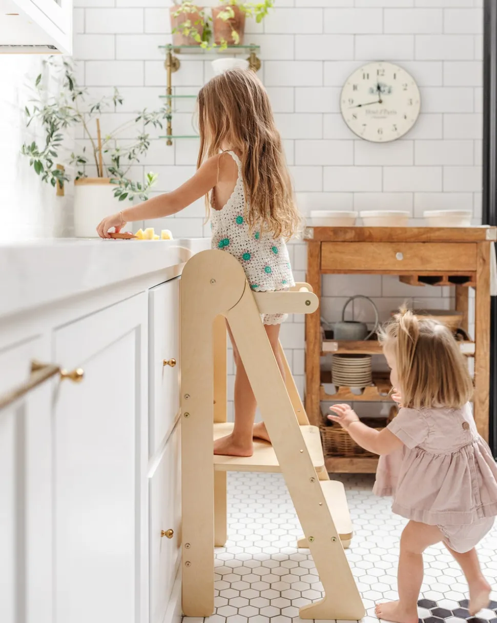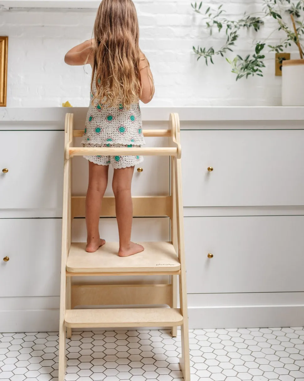 From Venice, California Piccalio creates modern, unique wooden products that inspire kids to think for themselves and to play with endless curiosity. With safety, slow living, and nature at its heart, Piccalio employs European design and small-batch manufacturing to create sustainable playthings that can be passed from between kids, and generations. Step right up! The Mini Chef Convertible Helper Tower gives your little one the independence to safely reach kitchen countertops, bathroom sinks, and any too-tall-to-access places. We love it for helping out at meal time, and once you’ve finished preparing, just fold it up and tuck it away — until the next meal. It also offers friendly access to the bathroom sink and any other hard-to-reach places.