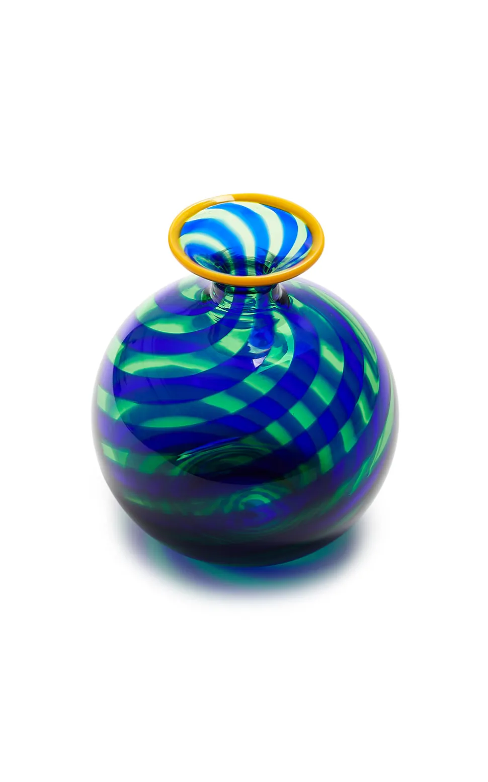 The inspiring authority on feel-good fashion, energy elevation, and the ebullient Italian way of life, La DoubleJ was launched in 2015 by J.J. Martin. Beginning as a magazine, the brand soon took flight in 2017 with original collections of new fashion and homeware with in eye-popping prints, cut with easy glamour. The Mini Ciccio Vase in Rigadin Twist Blue is crafted from hand-blown Murano glass, making it one-of-a-kind. Striped and ridged, fill it with buds for a romantic tablescape.