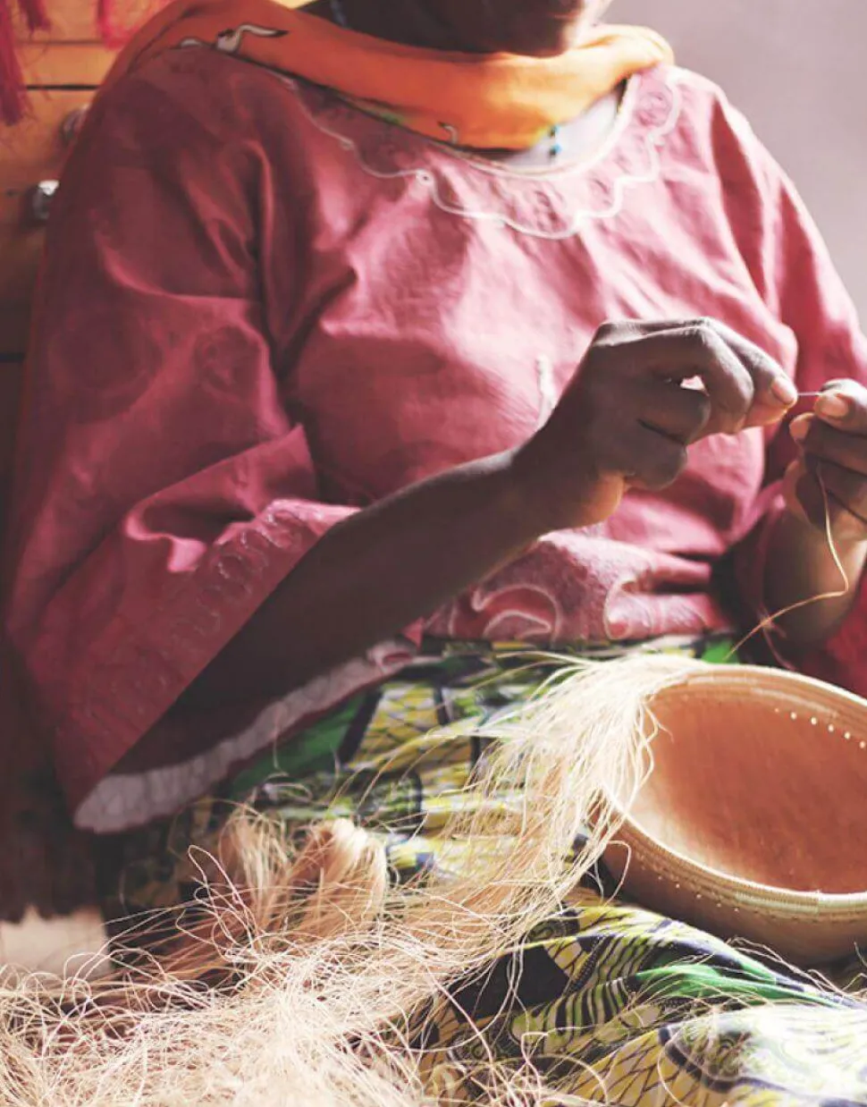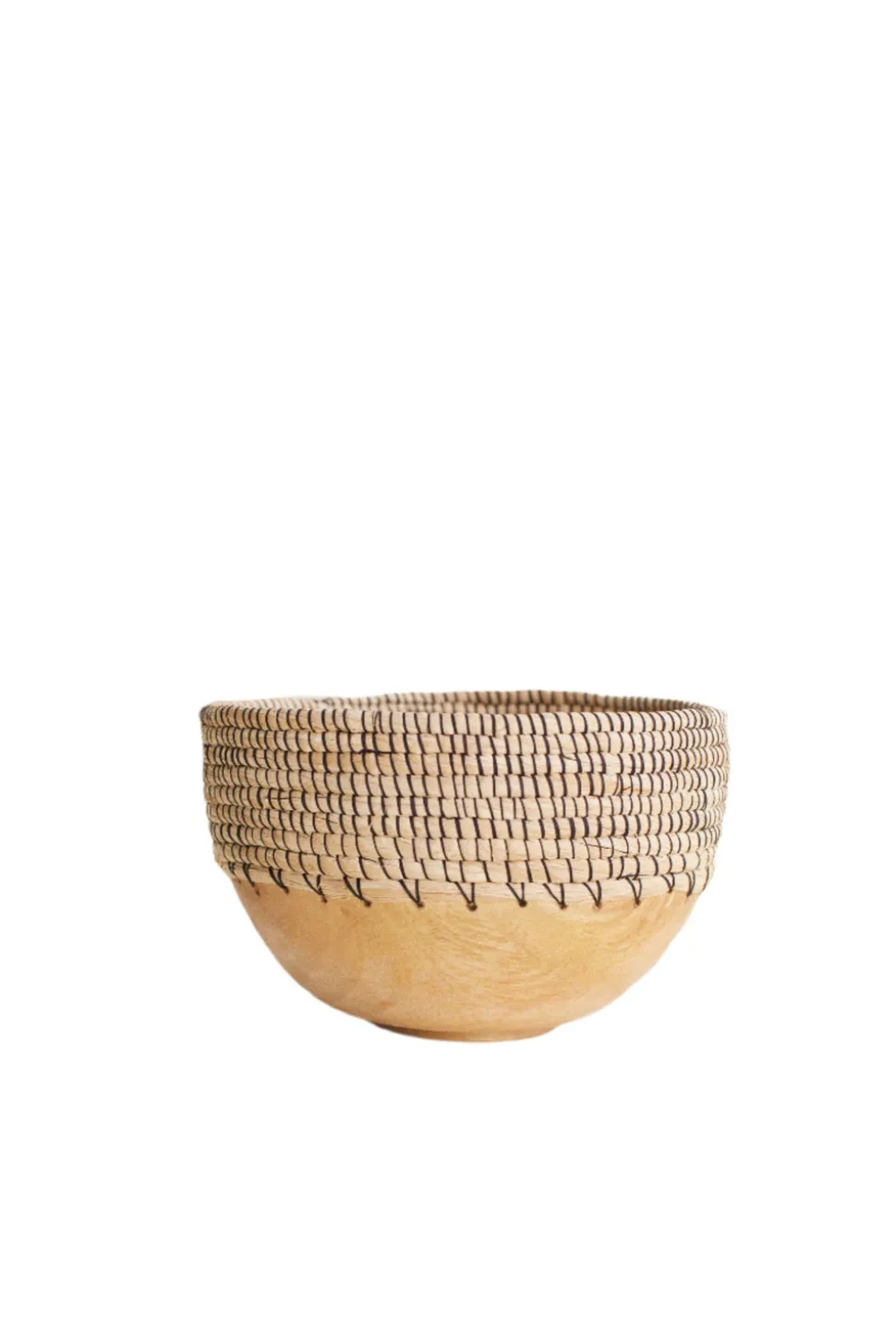 Natural finish. Natural color accented with black. Features a base made from jacaranda wood and a rim handwoven from strands of locally sourced raffia fiber in natural and black. Hand-carved from the durable wood of the Jacaranda trees that line the streets of Kigali, Rwanda. Due to the handmade quality, some size and color variation may occur.