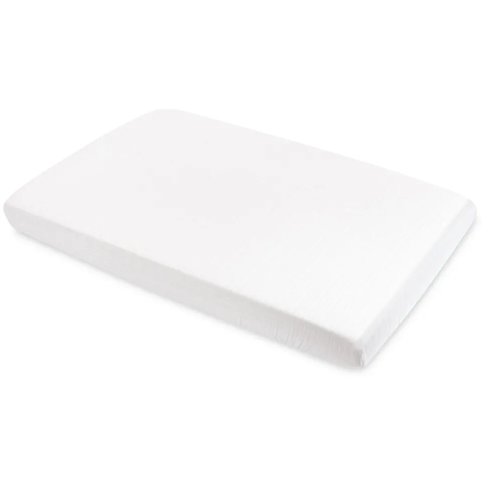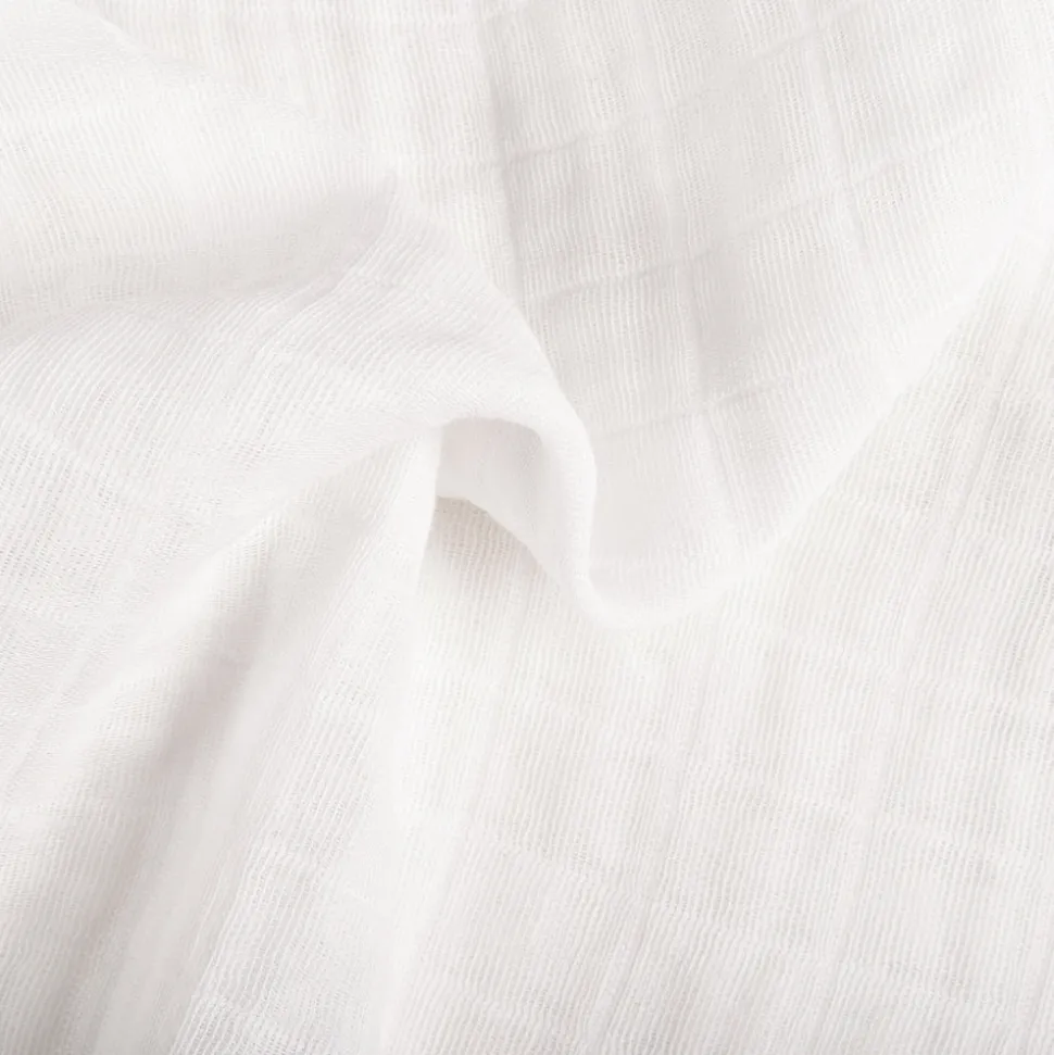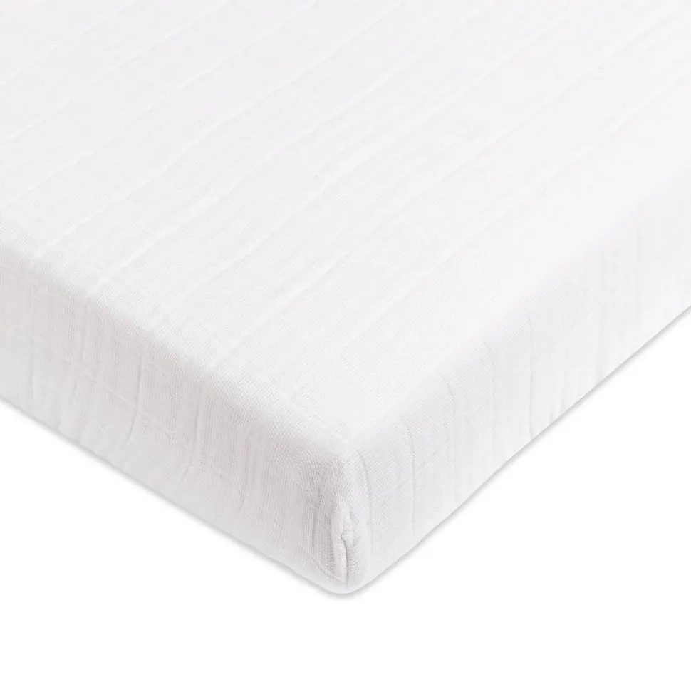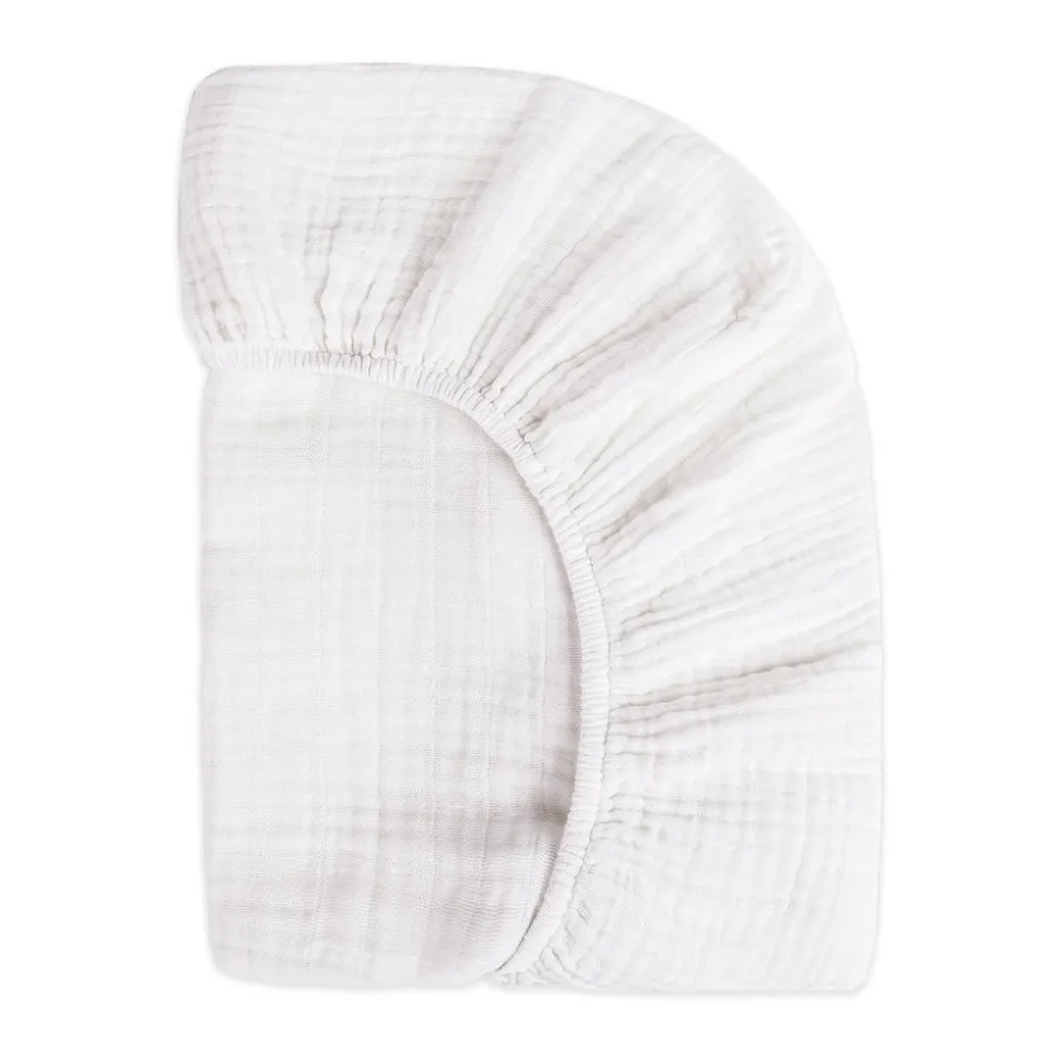 White. 100% GOTS-certified organic muslin cotton. Breathable, lightweight, and soft. Elasticized edges for a snug fit. Designed for mini crib mattresses.