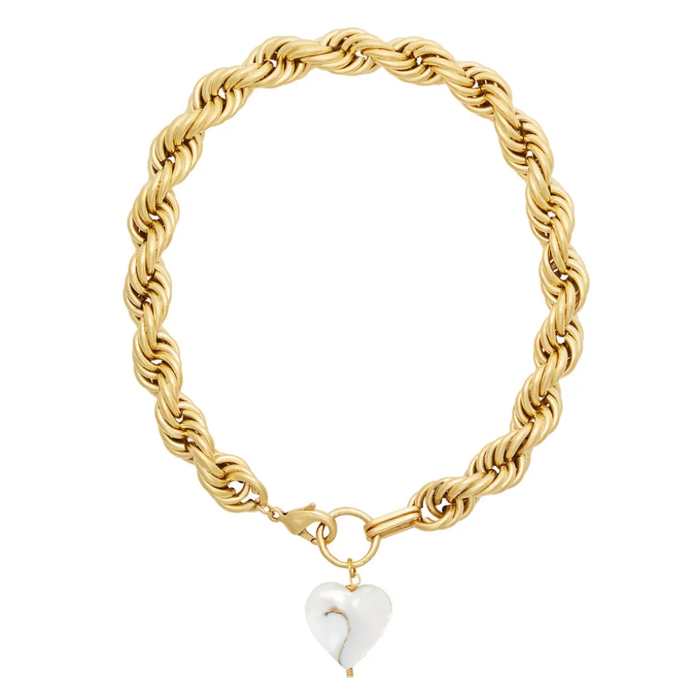 24K antique gold-plated chain. Mother-of-pearl heart. Lobster claw closure.