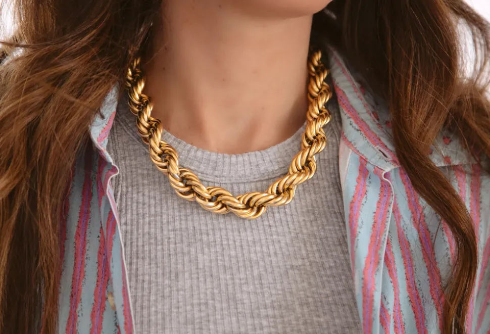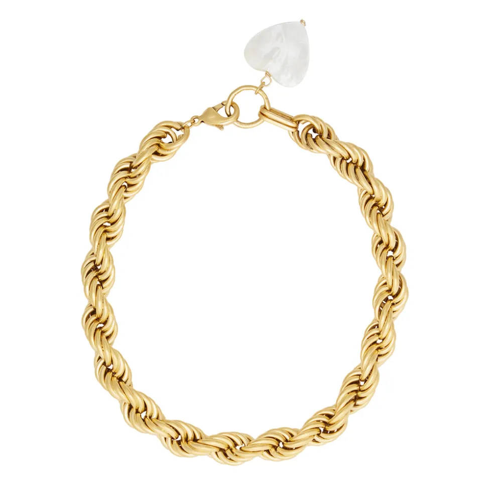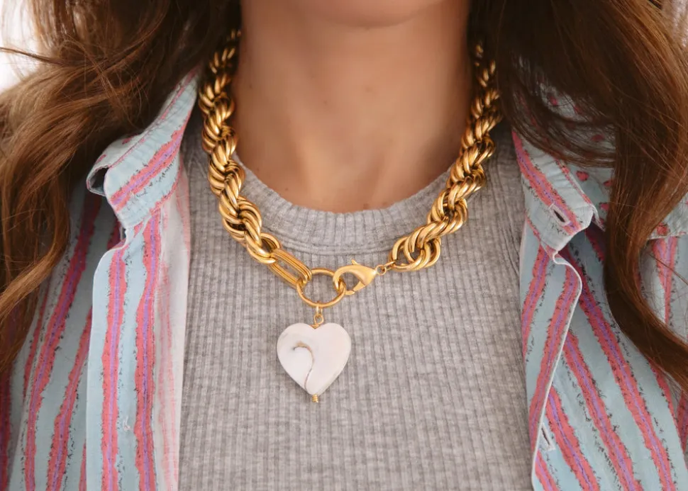 The mother-daughter duo behind Brinker + Eliza combine their experience in metalsmithing and fashion to create incredibly unique jewelry that feels custom-made. Employing pearls, shells, and earth’s most prized organic forms, these are pieces to be not just worn but treasured. A mother-of-pearl heart hangs from a 24K gold-plated rolled rope chain on the Mini Showstopper Necklace.