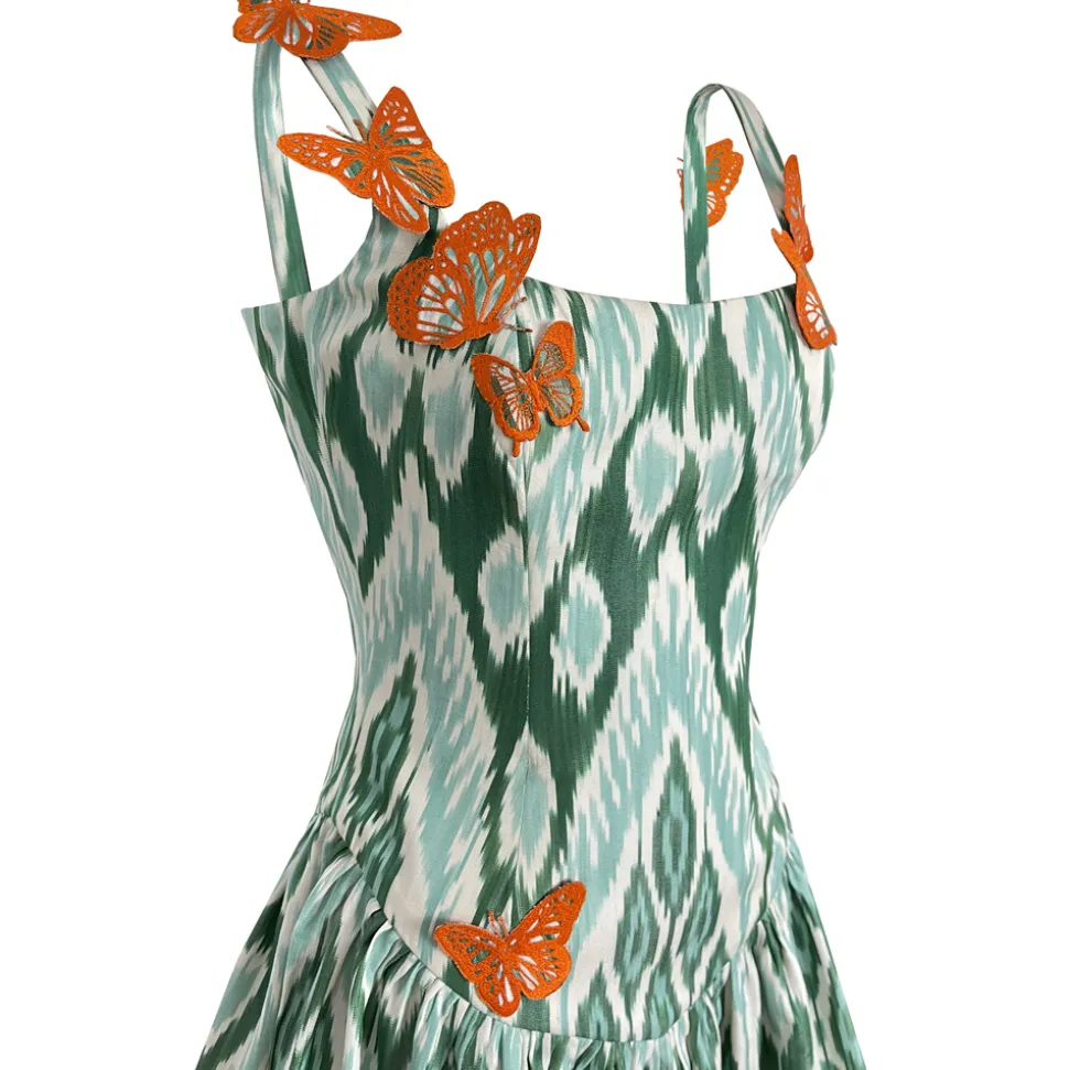 De Castro showcases a seamless and unique blend of traditional Indian craftsmanship, contemporary design, and the founder’s Colombian heritage. Every piece is handmade by artisans, using time-honored techniques and the finest cotton and silk fibers, resulting in exceptional quality, sustainability, and style. The Mint Mirage Dress is made from handwoven silk ikat from South India, showcasing abstract green, mint, off-white, and deep green designs. It features a snug corset waist that seamlessly flows into a charming mini skirt, resulting in a figure-flattering silhouette. Adorned with intricate orange embroidered butterflies, the fabric adds a delicate touch of whimsy. Equipped with a back zip and adjustable straps, this dress is an essential addition to any summer wardrobe.