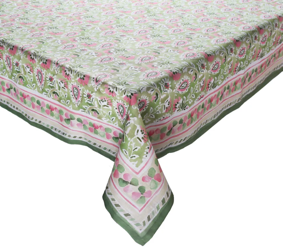 Kim Seybert designs artisan-made tabletop decor and luxury home accessories. Create a well-dressed dining look with the brand’s range of elegant tableware, placemats, runners, chargers, plates, napkins, flatware, and more. The Mira Tablecloth in Green & Pink is a vibrant, hand-painted paisley pattern is digitally printed on this luxurious linen tablecloth. The Mira tablecloth features neutral vines interlaced over a soft green backdrop, punctuated by pops of bright pinks and deep greens. This tablecloth brings a breath of fresh air to any occasion, from garden parties to bridal showers.