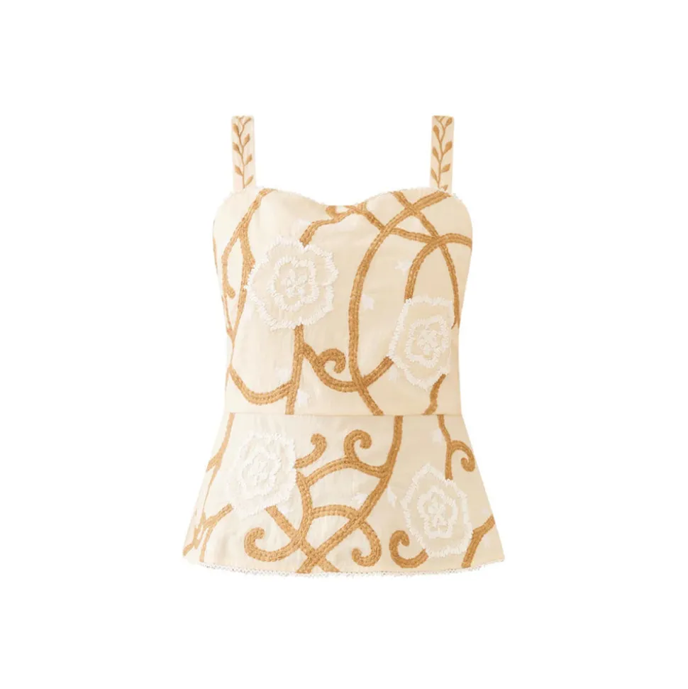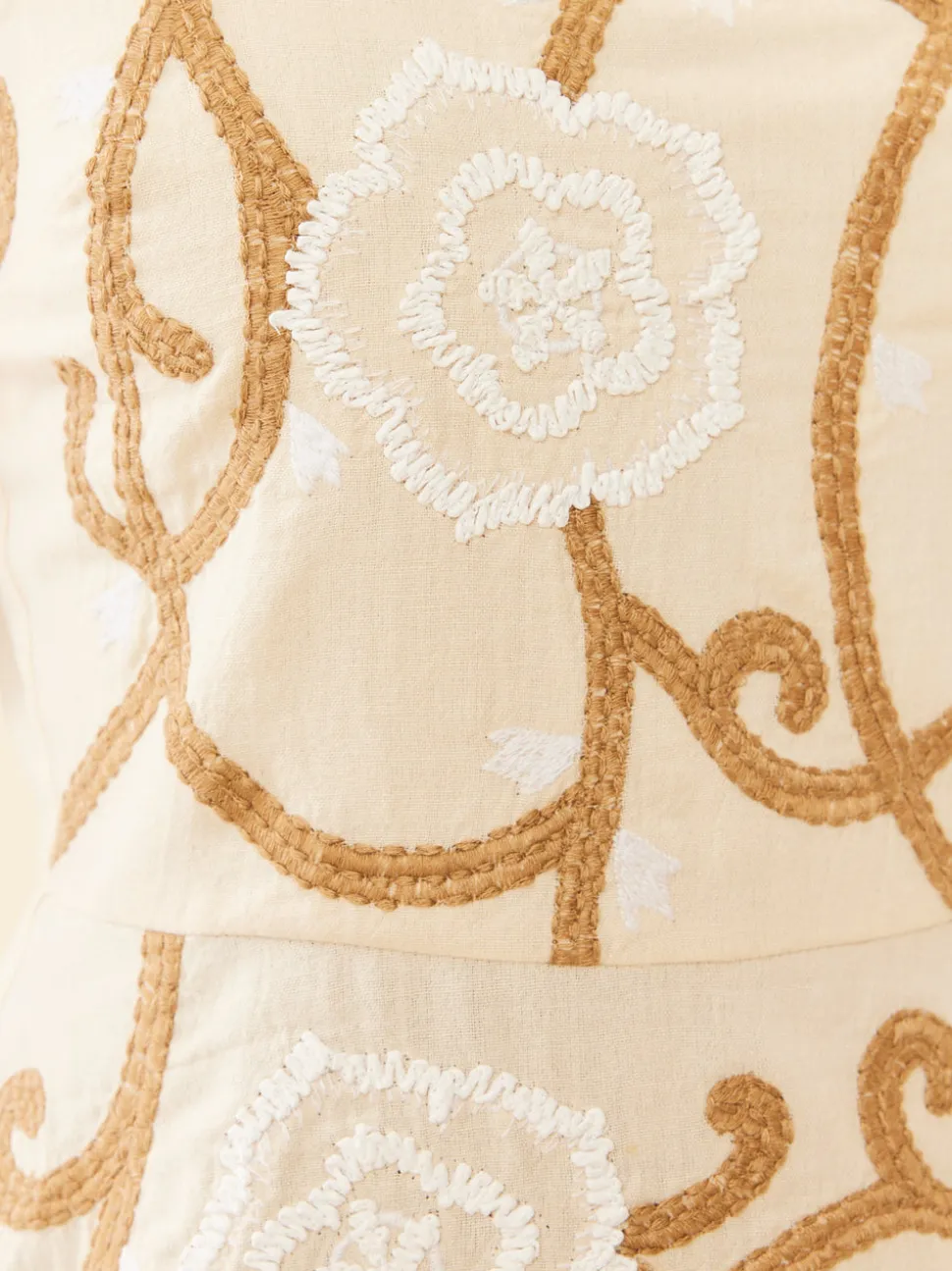 70% cotton, 30% linen. Peplum waist tank. Natural raffia embroidery details. Center back zipper. Adjustable straps. Khaki base color with white and brown detailing. Made in India.