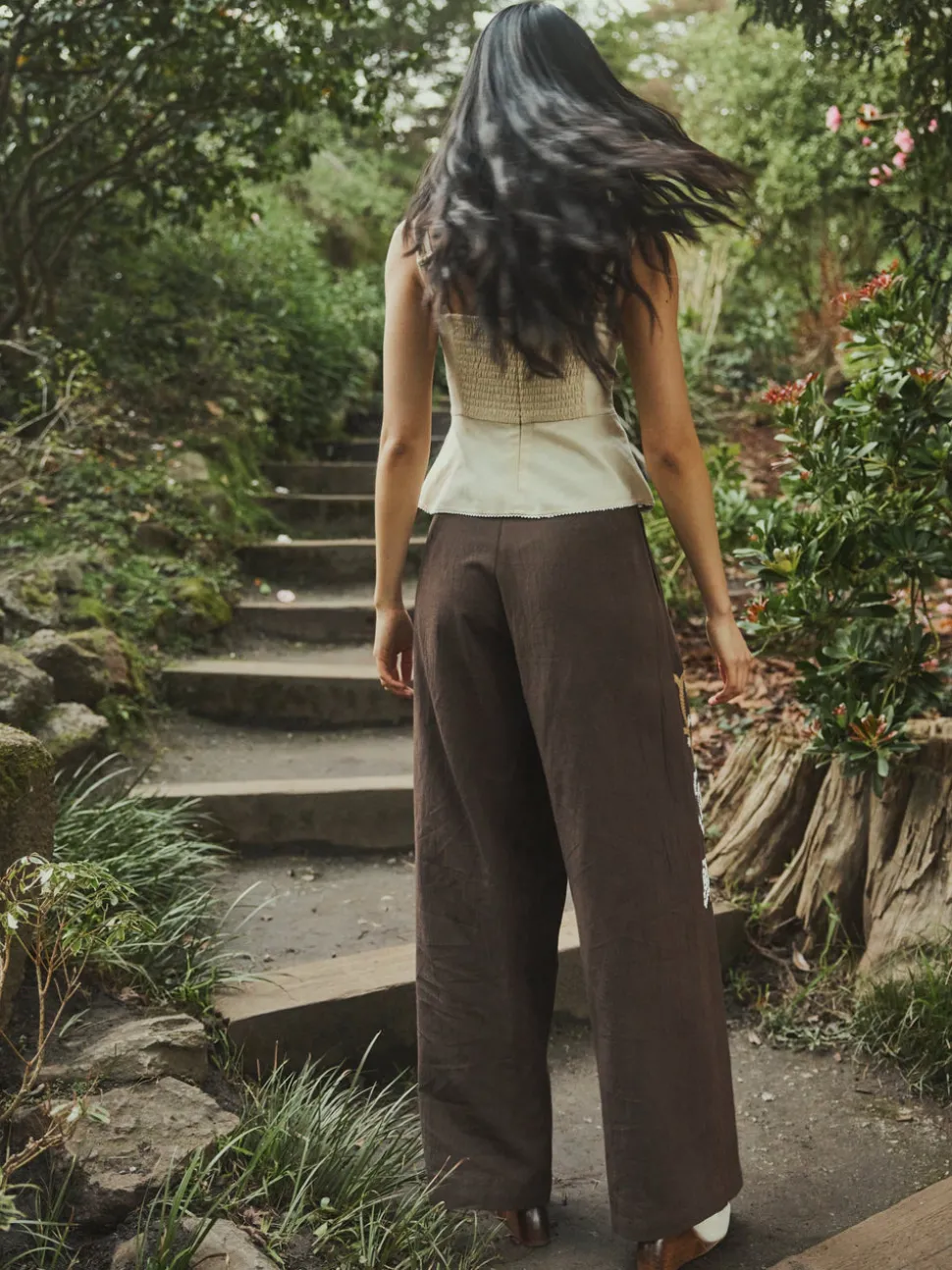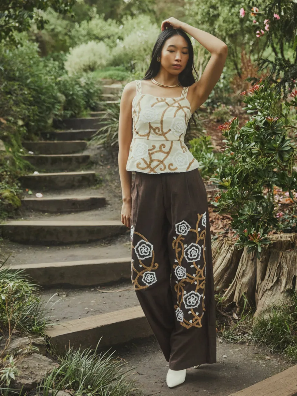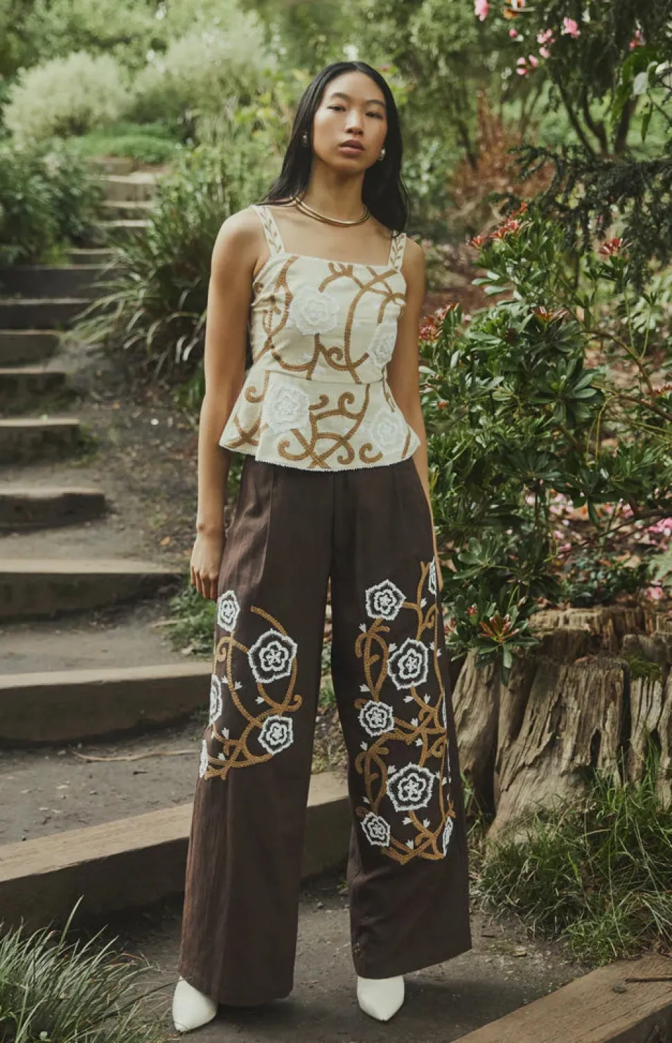 Tomboy looks, girly-girl styles, and an always fashionable approach define Eddy’s aesthetic. With a focus on bold and feminine silhouettes, Eddy dresses and tops pair elevated California bohemian with global inspiration; these are clothes designed to make you feel good inside and out. The Miranda Top in Khaki Garden is a peplum waisted top. Created with adjustable straps, a center back zipper and slight back smocking with an emphasis on comfort. Natural raffia embroidery covers the front. Pairs well with Nina Pant.