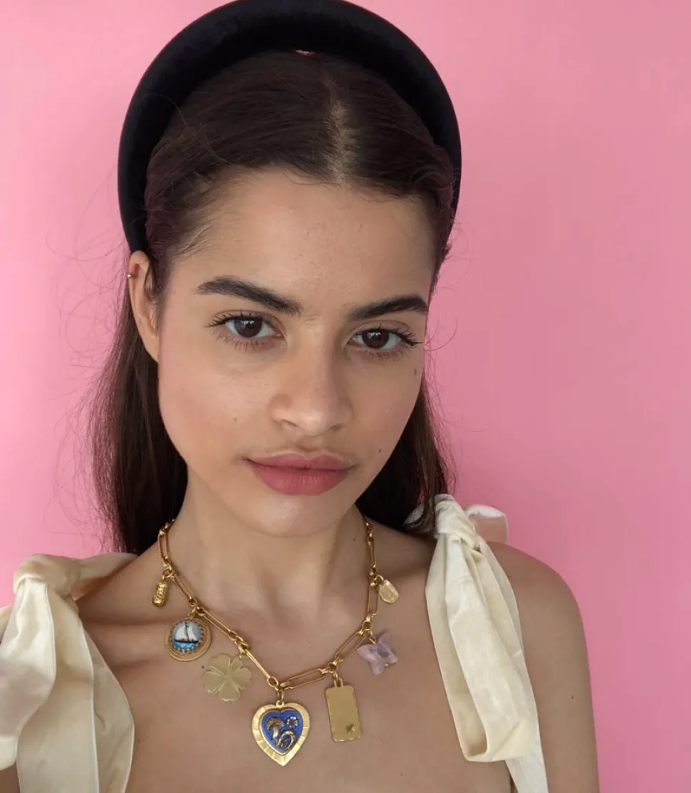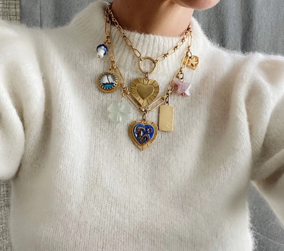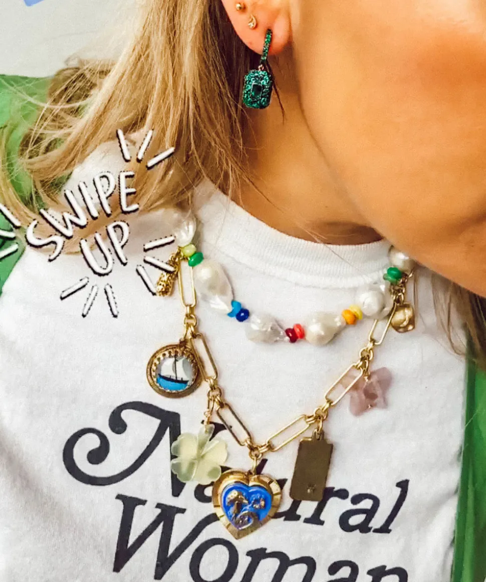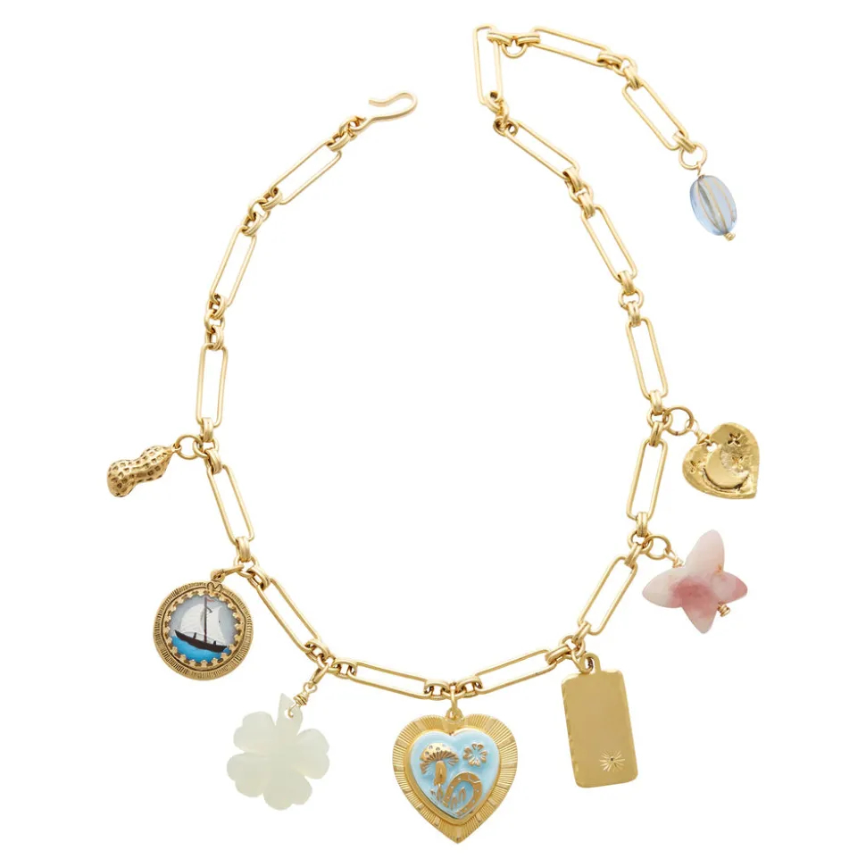 The mother-daughter duo behind Brinker + Eliza combine their experience in metalsmithing and fashion to create incredibly unique jewelry that feels custom-made. Employing pearls, shells, and earth’s most prized organic forms, these are pieces to be not just worn but treasured. Who doesn’t love a little mischief, especially when it comes in for a golden chain, adorned with charms like a gold-plated peanut, hand-painted sailboat intaglio, and pink opal butterfly, among other vintage wonders?