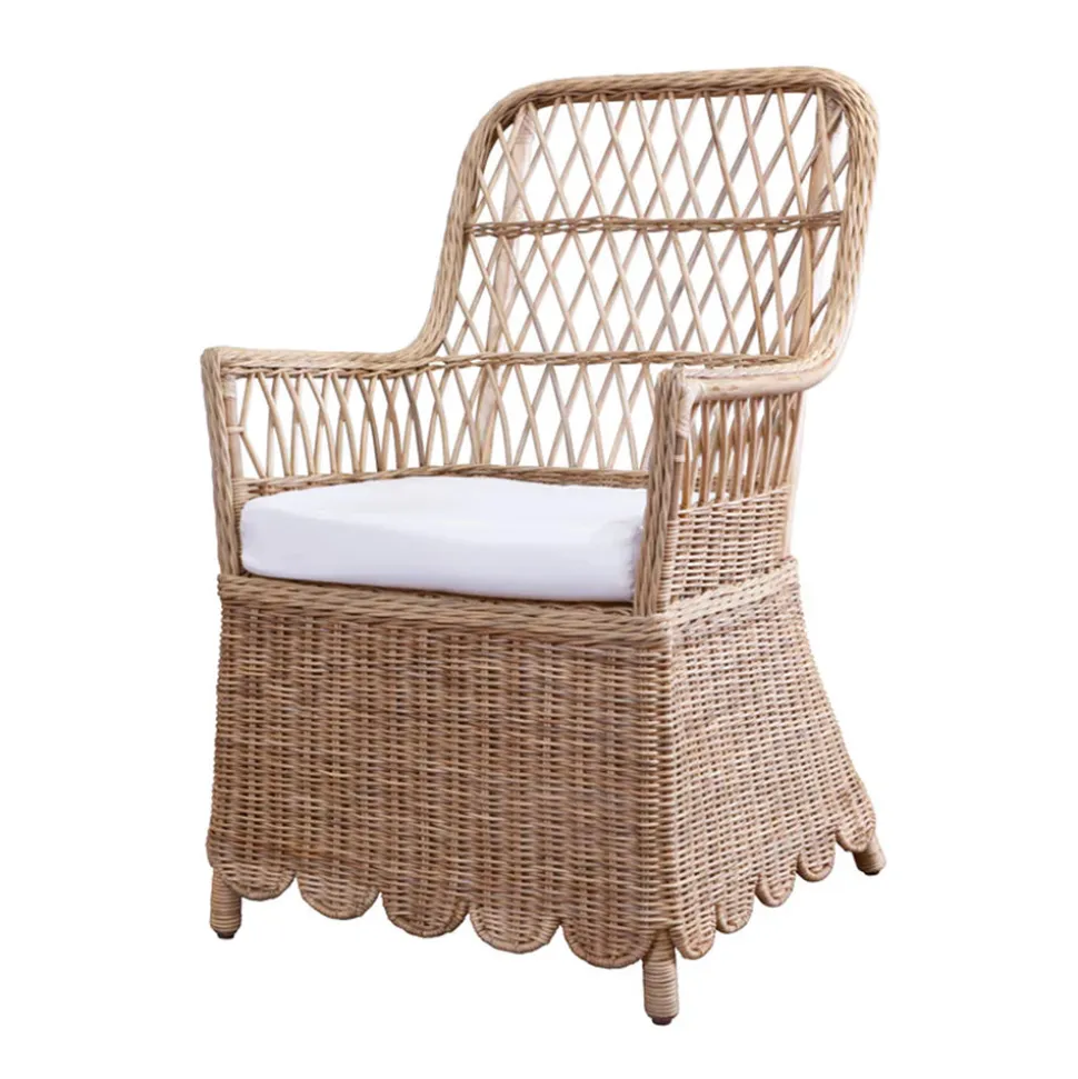 Mainly Baskets Home is dedicated to crafts made of rattan and the ancient and beloved process of weaving known as wicker. Inspired by antique and vintage designs, as well as talented collaborators and skilled artisans, these pieces share a sense of both quality and timelessness. The Caitlin Wilson Monaco Collection shines a light on the love for wicker furniture and charming design details. The Monaco Collection combines the chic lifestyle with the natural charm and effortless coastal French style. The Monaco Chair features a scalloped edged skirt and effortless hand-woven wicker for a stylish seating in your living area or covered porch. An optional cushion is available in a versatile Sunbrella fabric. Pair it with the Monaco Foot Stool and Coco Dining Table for the complete, coordinated look.