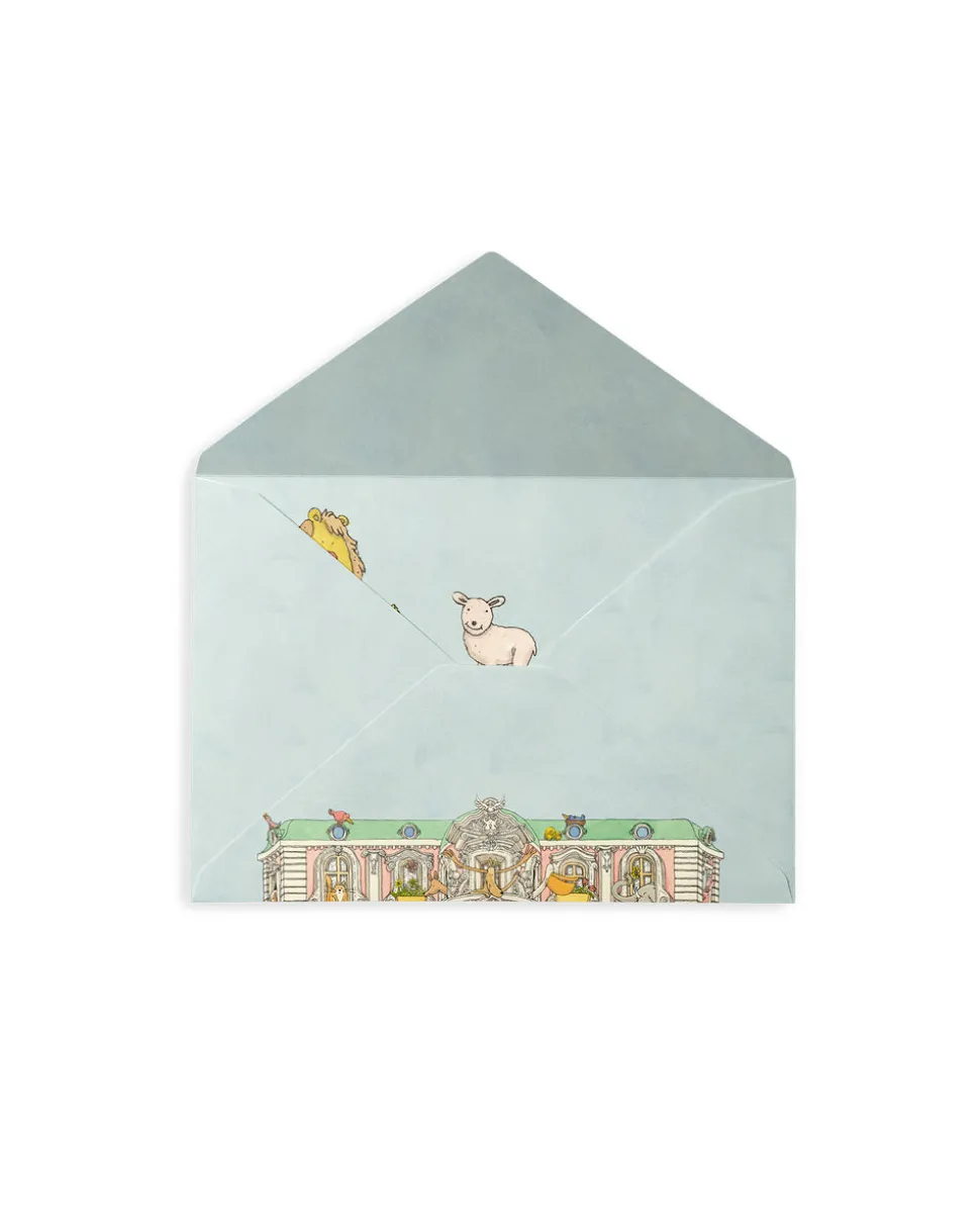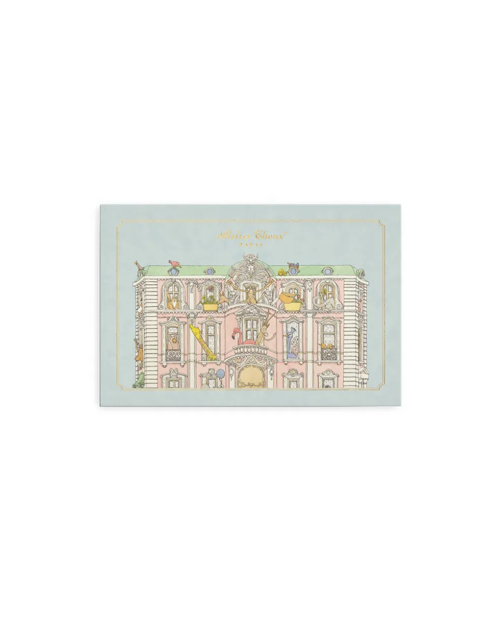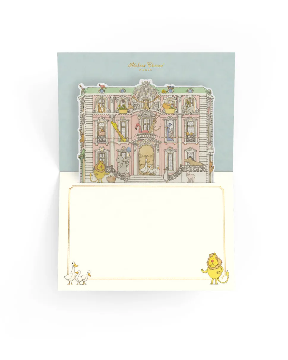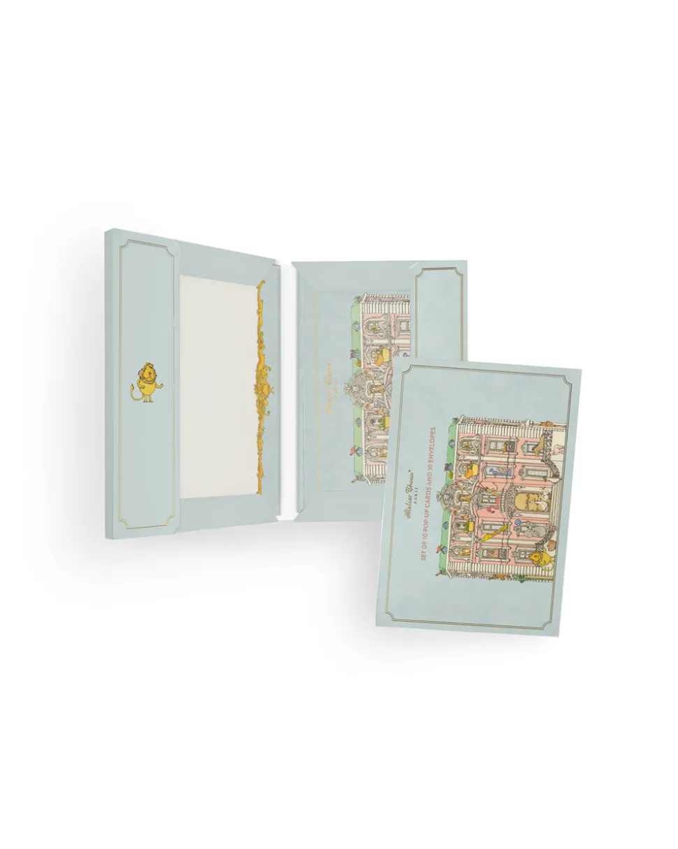 A new French maison for millennial families, Atelier Choux is a lifestyle brand that focuses on interior design in its bedding, textile accessories, wall décor, clothing, and collectible gift boxes. Inspired by Troisième Empire Parisian architecture, each item balances tongue-in-cheek humor with sophistication, revealed in recurring themes like elaborate buildings, simple charismatic animals, fanciful crests, and hot air balloons. The Monceau Mansion Pop-Up Stationery Set includes 10 blank 300 gram 3D pop-up cards with gold foil accents and matching gold-foil envelopes. The blank writing space can be used for thank you cards, invitations or for everyday chic correspondences. Each handcrafted set includes a decorative sleeve, with cards on the right and matching envelopes on the left.