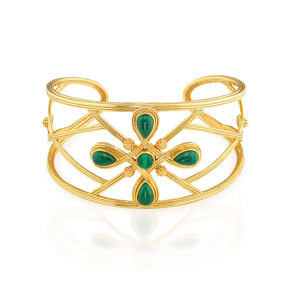 Half-Parisian, half-Texan, Capucine De Wulf’s unique upbringing was the inspiration for her namesake jewelry line. Her accessories combine French romance with an American sensibility. The Monique Gem Cuff in Malachite honors Capucine’s grandmother, Monique De Wulf—a true Grande Dame de Paris known for her strength, warmth, and unshakable grace. Crafted with radiant green malachite and gleaming gold, the cuff’s compass motif symbolizes wisdom and intuition, reminding its wearer to follow her own true north with courage and heart.