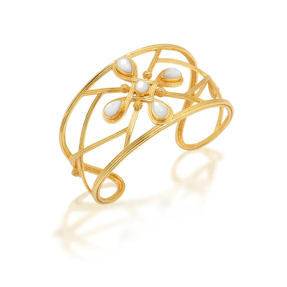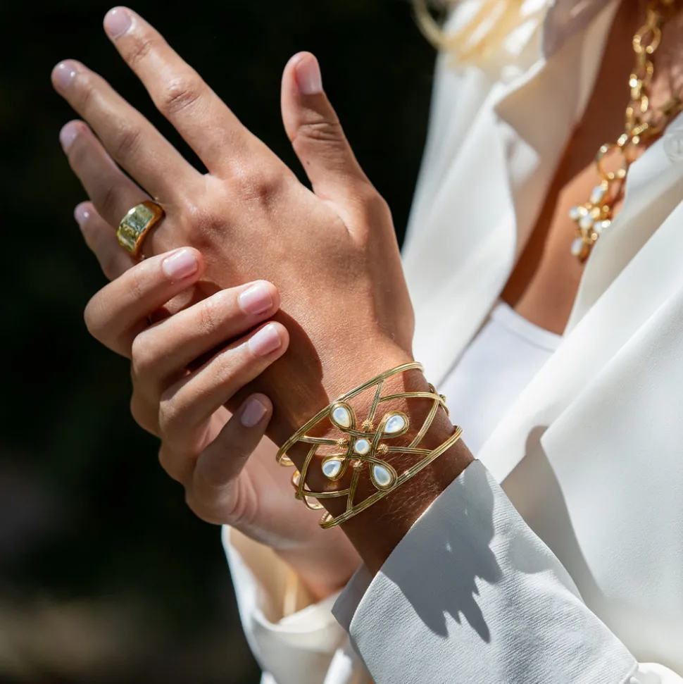 Half-Parisian, half-Texan, Capucine De Wulf’s unique upbringing was the inspiration for her namesake jewelry line. Her accessories combine French romance with an American sensibility. The Monique Gem Cuff in Mother of Pearl pays tribute to Capucine’s beloved grandmother, Monique De Wulf—a true Grande Dame de Paris known for her strength, grace, and joie de vivre. A compass motif in luminous mother of pearl and gleaming gold symbolizes guidance and inner truth, serving as a reminder to follow your own true north with elegance and conviction.