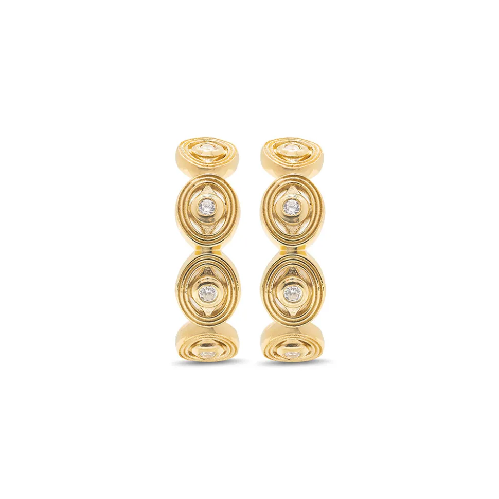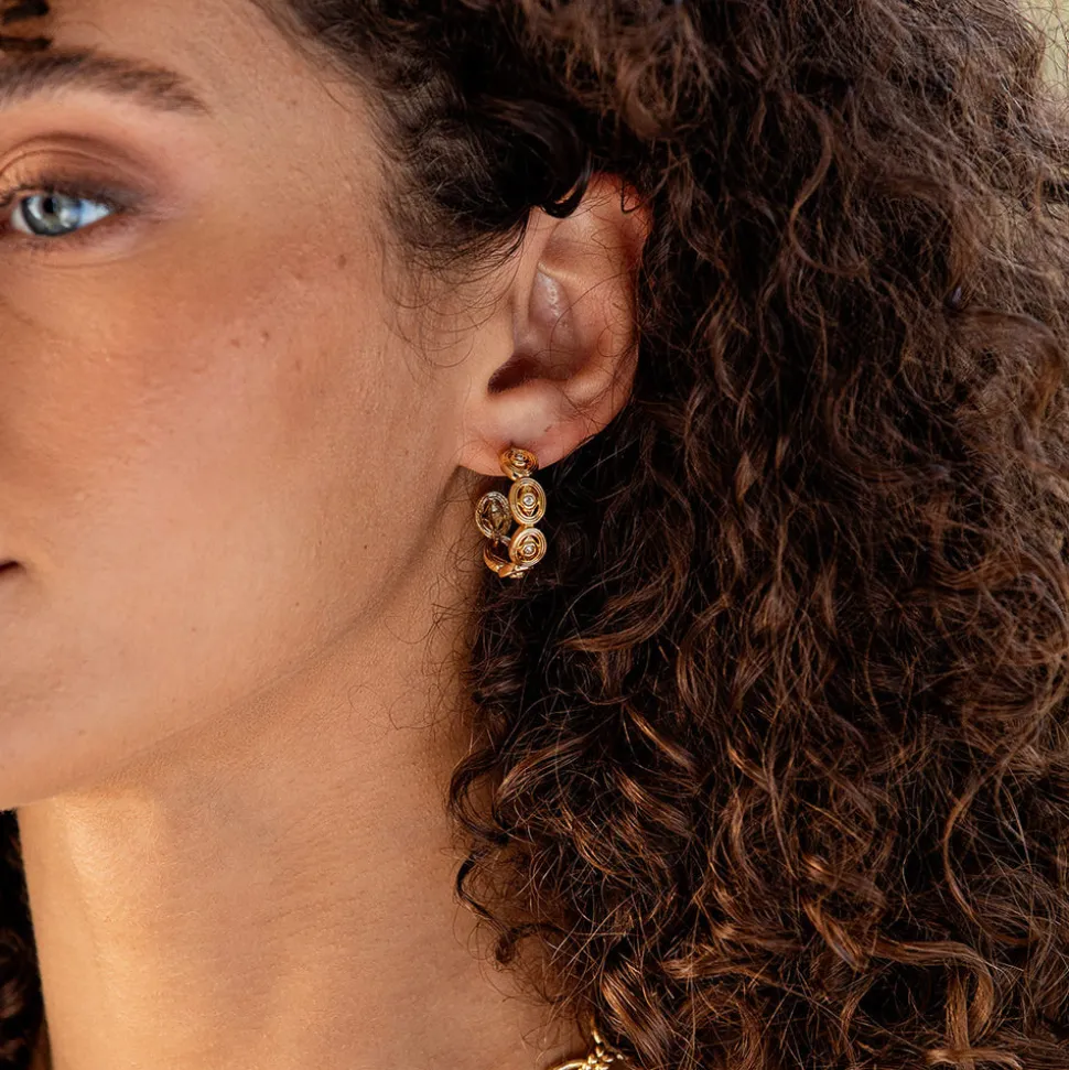 Half-Parisian, half-Texan, Capucine De Wulf’s unique upbringing was the inspiration for her namesake jewelry line. Her accessories combine French romance with an American sensibility, as with the Monique Hoop Earrings in Gold & Cubic Zirconia. Named for the designer’s grandmother, a grande dame of Paris, these ornate hoops boast a line of cubic zirconia, and call out to elegant times past.