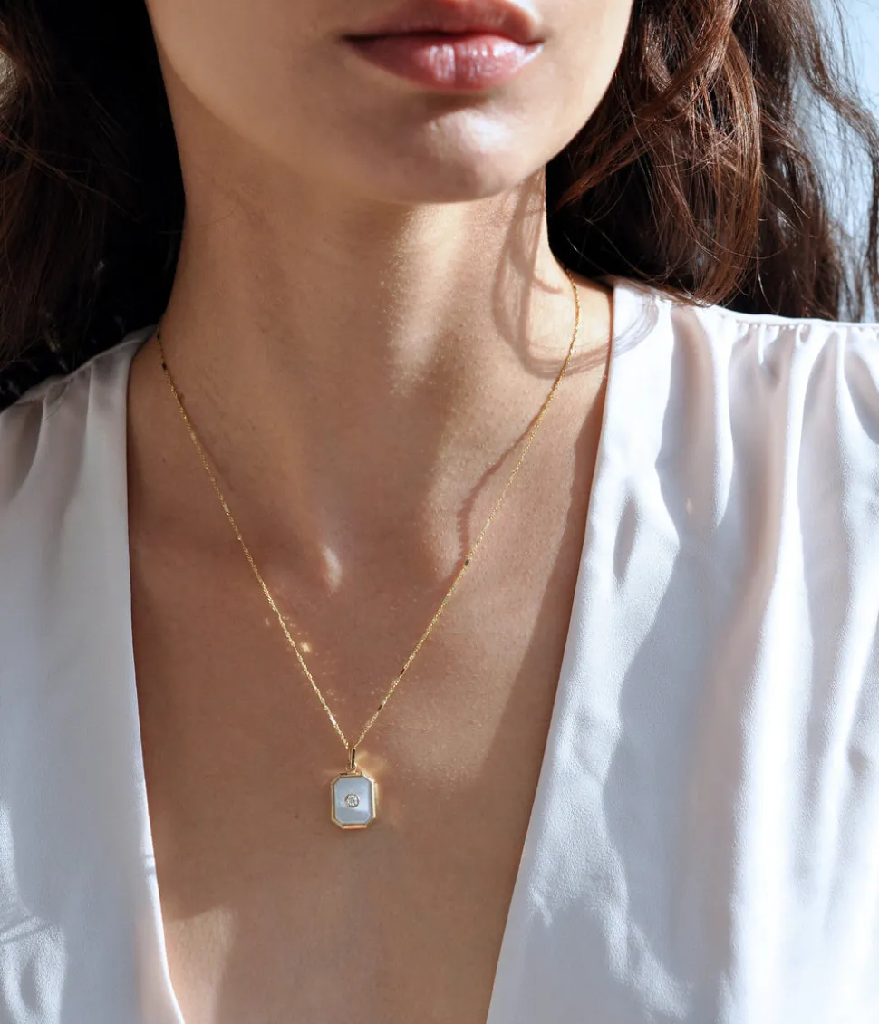 From her studio in New York City, Ashley Zhang designs one-of-a-kind fine jewelry that will last a lifetime. The Mother of Pearl Diamond Bezel Charm boasts a bezeled white diamond set in the midst of custom carved mother of pearl. It’s set on the brand’s signature rectangle bail, allowing for the charm to slide on most small to medium chains.