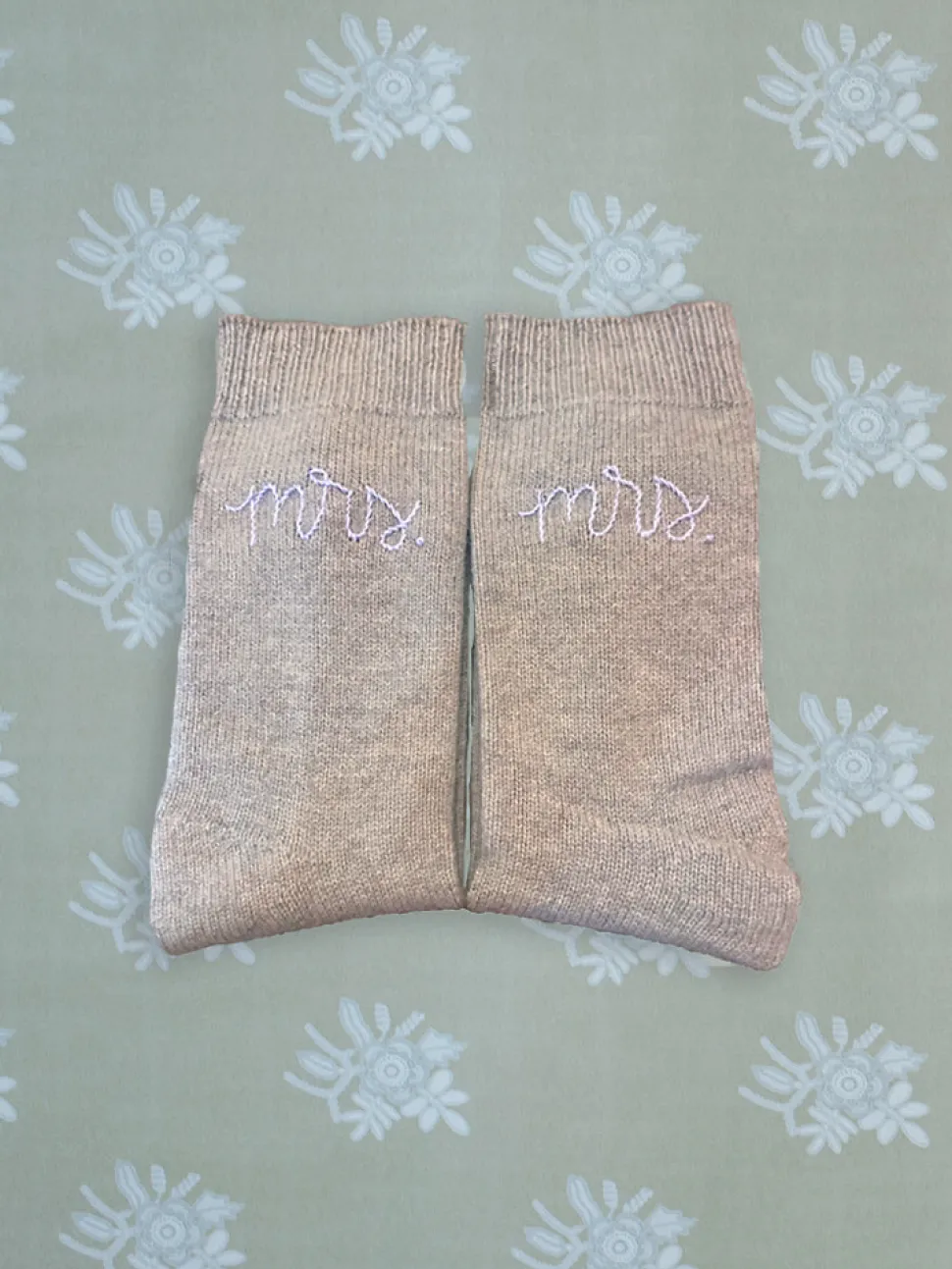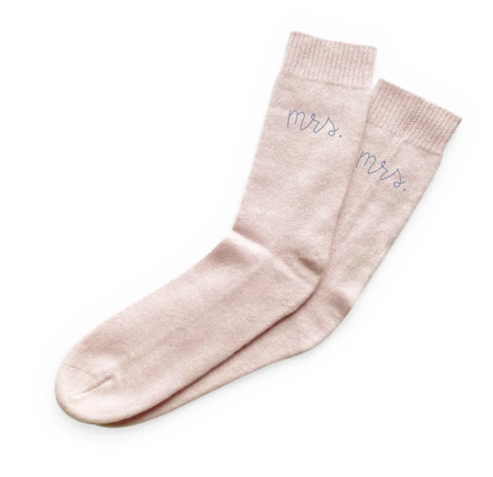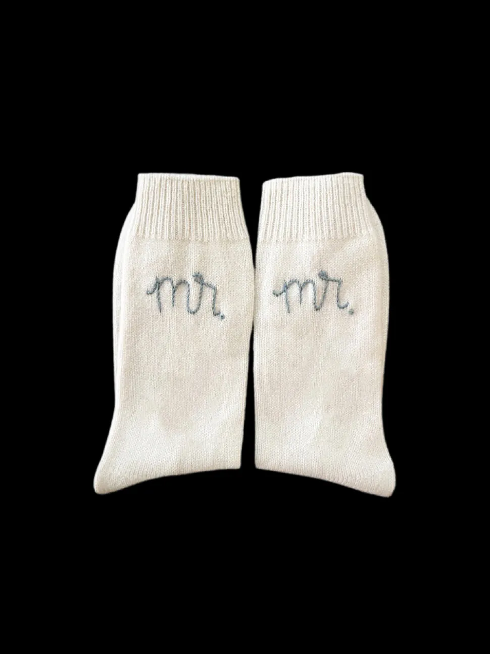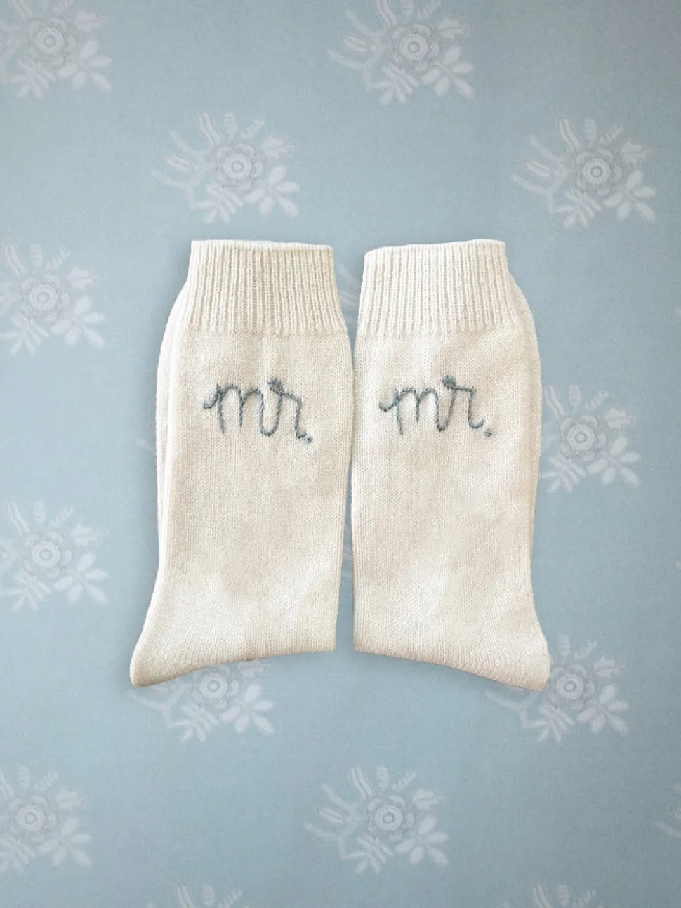Each saying or phrase on Lingua Franca’s staple pullover sweaters is chalked in script by designer Rachelle Hruska MacPherson before it’s ever stitched. Made from the softest, most sustainable cashmere, the includes Mr. and Mrs. Socks are not only the softest companion your (and his) feet will ever have, they arrive personalized with “Mr” or “Mrs” script. Now you’ll always know whose is whose; no stealing!