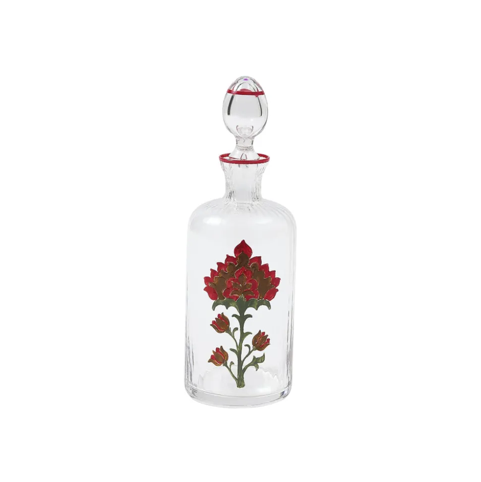 Founded by Martina Mondadori and Christoph Radl in 2014, Cabana Magazine inspires a new generation of globe-trotters on their journey through collecting, colors, and fabrics. The Cabana homewares collection brings its pages to life while evoking a distinctive Italian mood. These charming glass bottles are hand-blown and hand-painted in Italy from the highest quality Venetian glass. Each one is decorated with a floral motif inspired by the historic suzani textiles of central Asia. The cross-cultural mélange of artisanship and design inspiration typifies the Cabana spirt, which always searches new juxtapositions of references while honoring the highest standards of craft and material. The bottle features a contrasting red rim, and is perfect as an oil bottle or as a tiny vase for flowers.