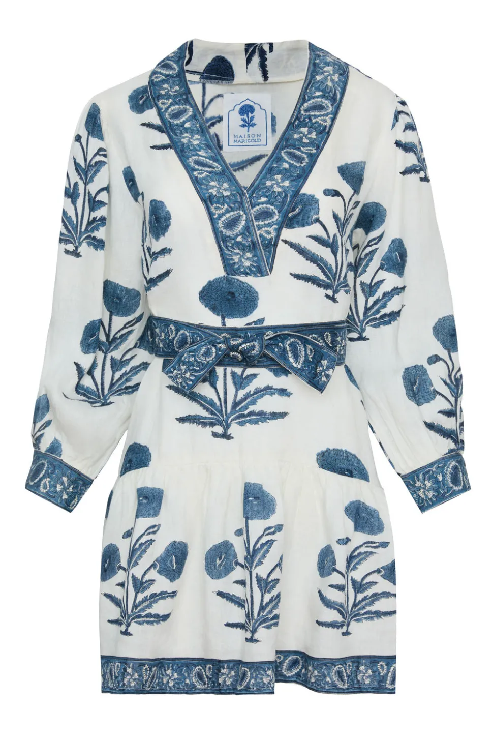 Introducing Maison Marigold, a new luxurious small-batch women’s resortwear brand inspired the wanderlust of travel. Our collections effortlessly transition from beachside lounging to an elegant evening on the town. The simplicity of design and classic silhouettes are the foundations for each and every style. Hand-printed linen and cotton make for comfortable and effortless pieces that are both feminine and flattering. The Mykonos Mini Dress has an feminine and flirty silhouette. The dress is hand block printed on 100% European linen with a V-neck opening and matching optional belt. This dress features hidden side seam pockets and adjustable mother-of-pearl buttons at the wrists.