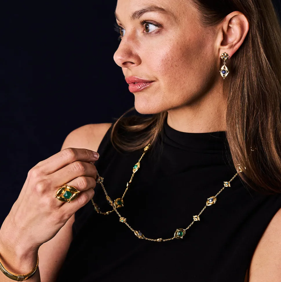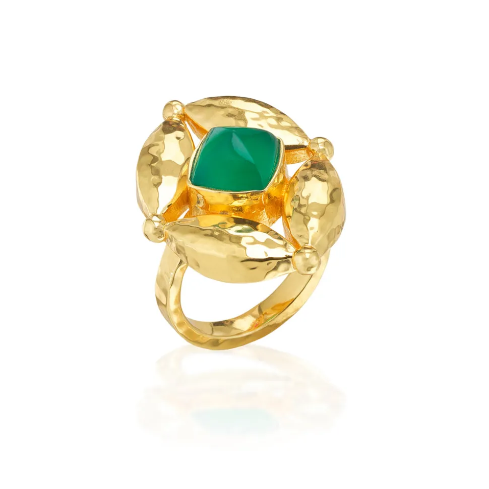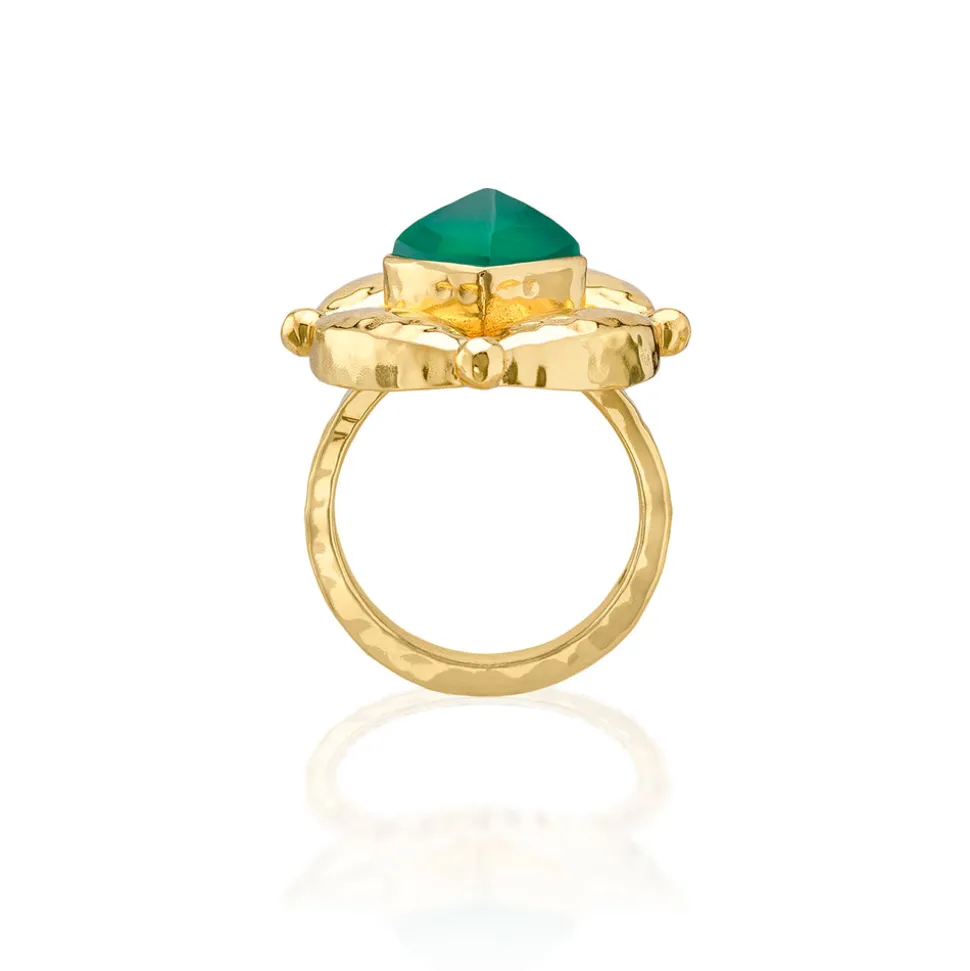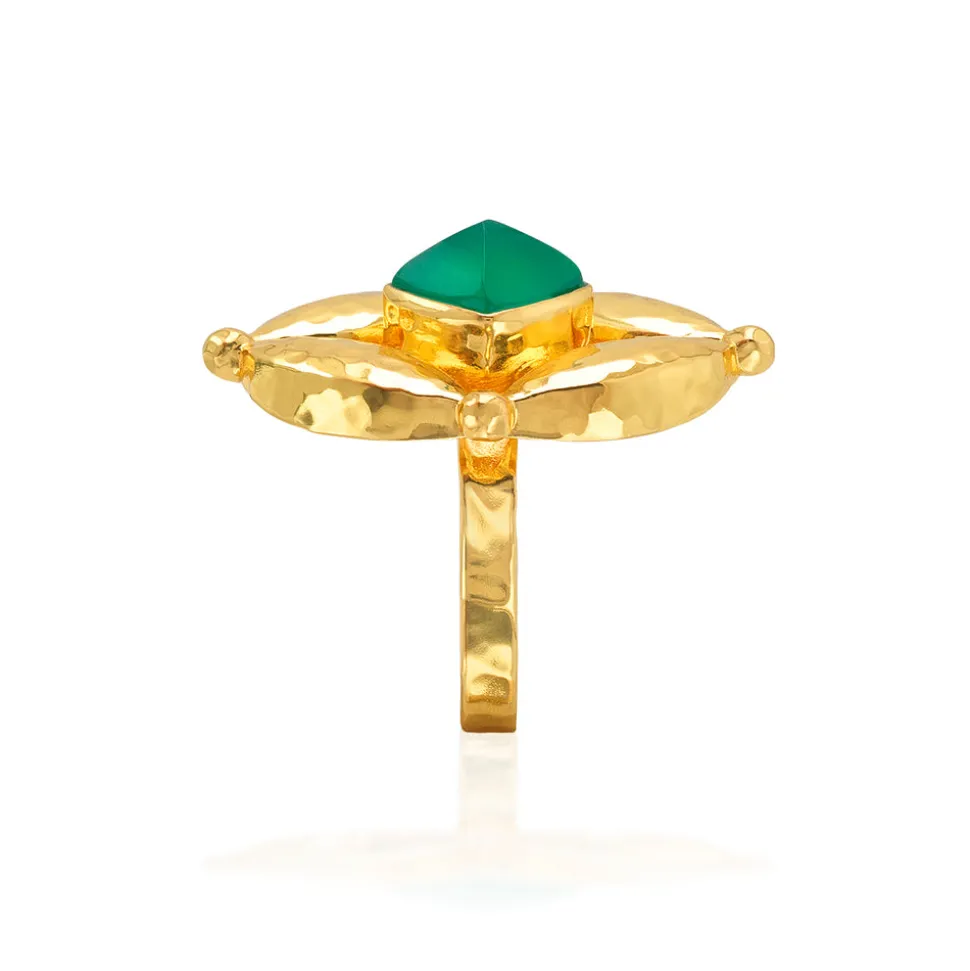 Half-Parisian, half-Texan, Capucine De Wulf’s unique upbringing was the inspiration for her namesake jewelry line. Her accessories combine French romance with an American sensibility. The Mystic Eye Ring in Green Onyx features a radiant green onyx gemstone framed within the brand’s signature Mystic Eye motif, crafted in luminous hammered gold. Representing intuition and balance, this striking statement piece inspires confidence and clarity—an elegant reminder to trust your inner vision.