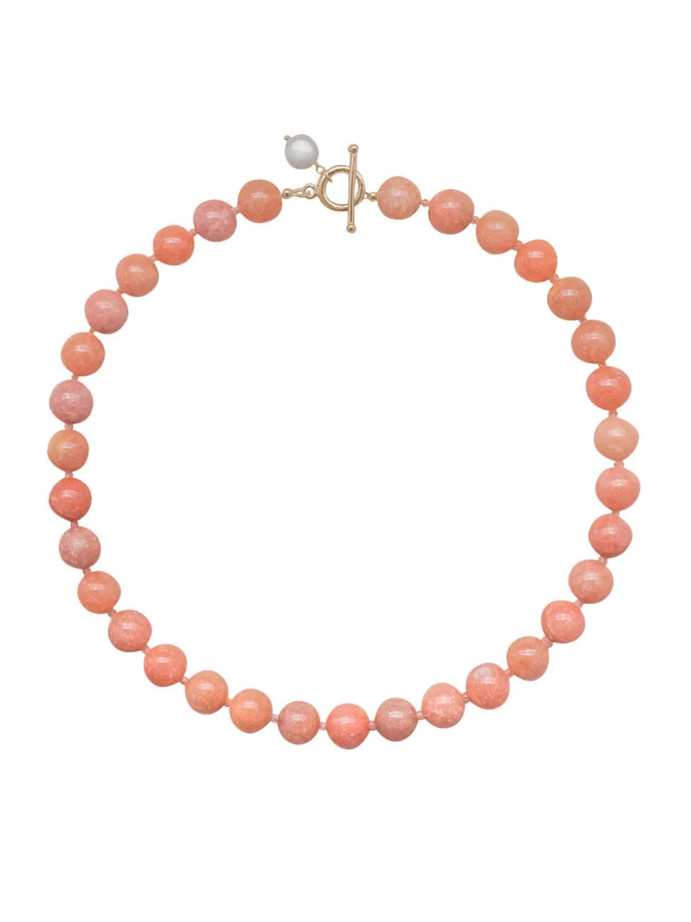 Peach calcite and faceted sunston gemstones, freshwater pearl charm. Gold-filled toggle closure. Handmade in Newport, Rhode Island.