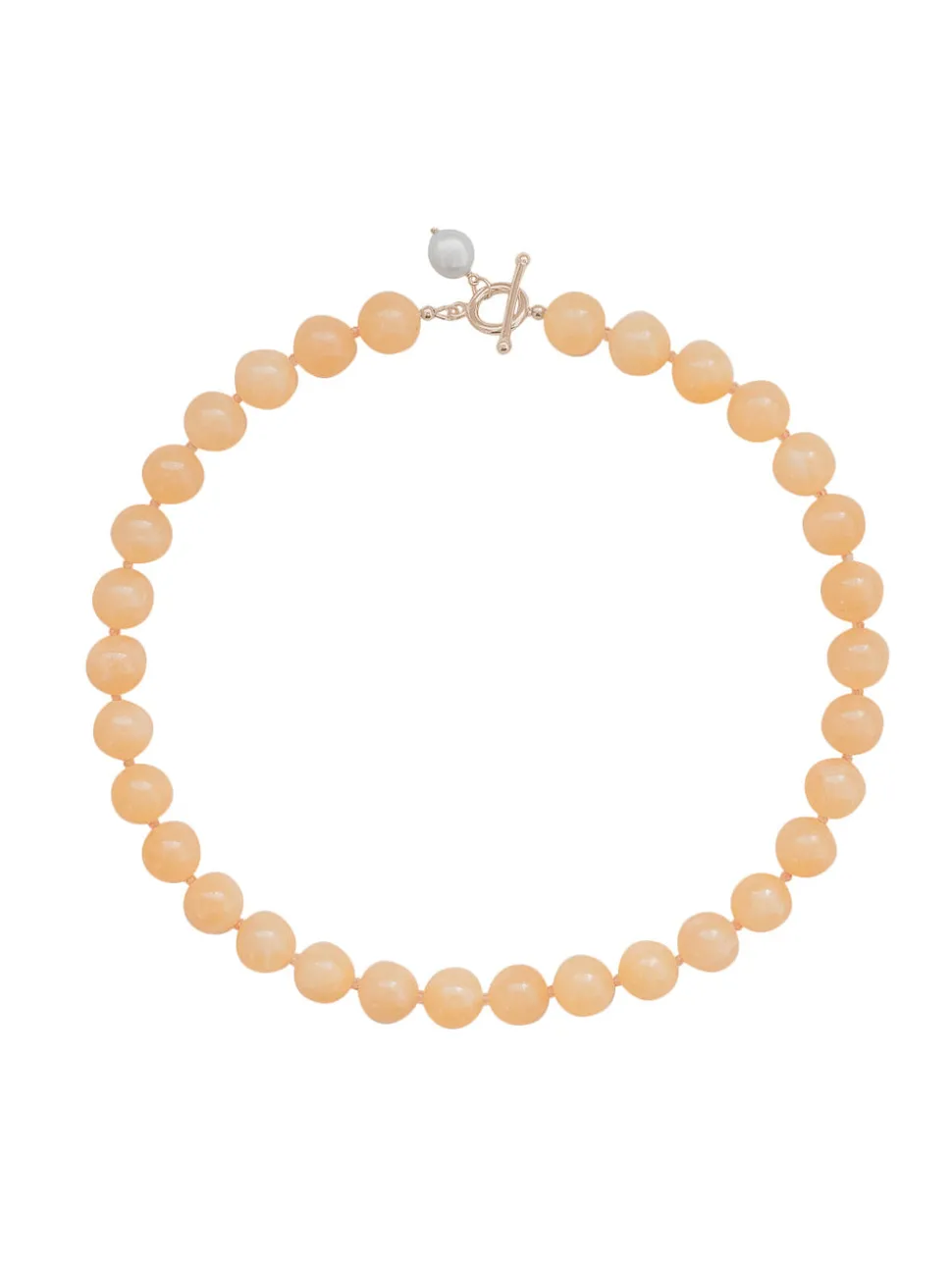 Yellow jade and faceted sunstone gemstones, freshwater pearl charm. Gold-plated toggle closure. Handmade in Newport, Rhode Island.