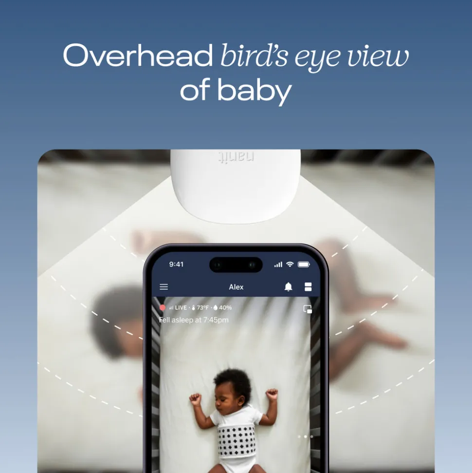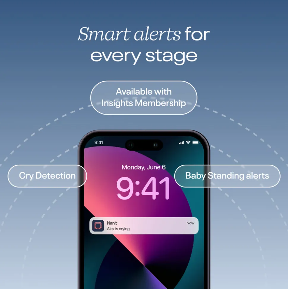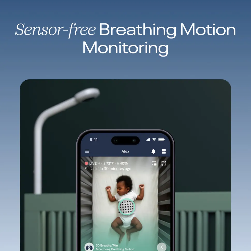 Breathing Motion Monitoring uses the included sensor-free Breathing Band to track your baby’s movement in nearly any sleep position—no wearables required. Receive smart notifications for sound, motion, cry, and cough, and keep your data safe with 256-bit AES encryption and two-factor authentication. Add multiple users and manage access directly through the Nanit app for seamless caregiver coordination.