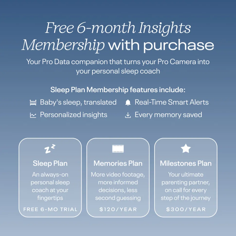 Includes: Nanit Pro Camera and companion app; easy-install ASTM-certified Wall Mount; Small sensor-free Breathing Band (0–3 months); Free trial of Nanit Insights Sleep Plan, which features sleep data tracking and personalized insights.