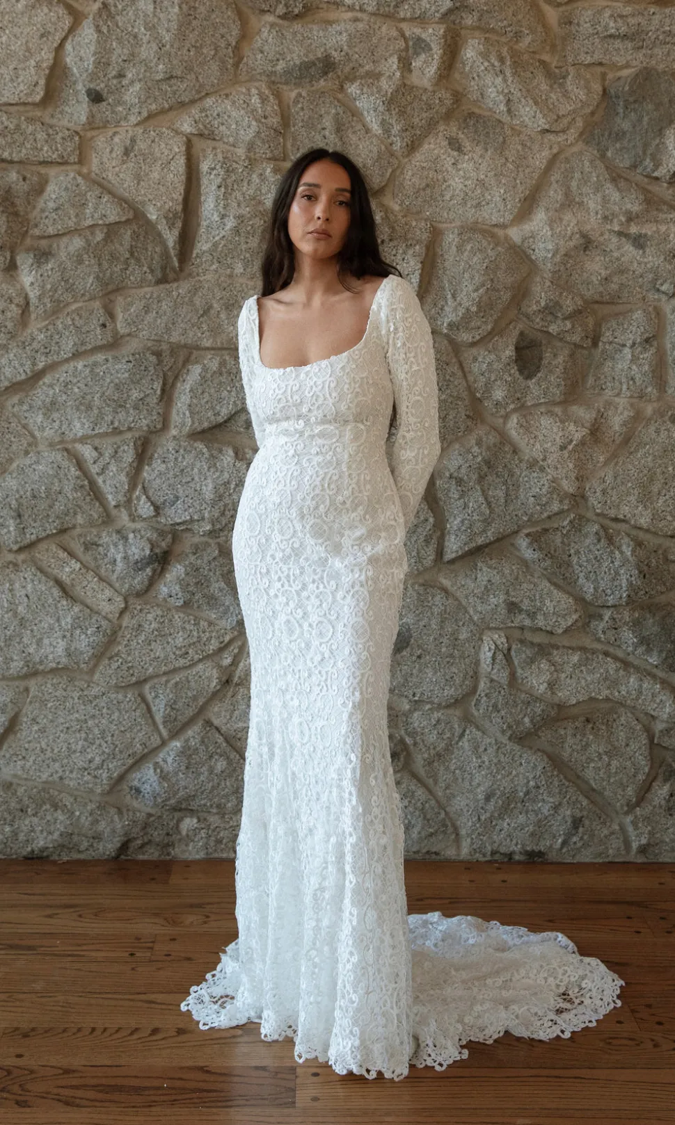 Nestled in California’s San Joaquin Valley, Daughters of Simone draws inspiration from American themes and culture, specializing in bridal wear and suits. The silhouettes evoke a blend of Victorian and Western influences, infused with the free-spirited essence of the 1970s. The Nash Crochet Lace Boat Neck Wedding Gown boasts guipure lace bateau, long elegant sleeves with a slight bell at the wrist, and a sweeping train.