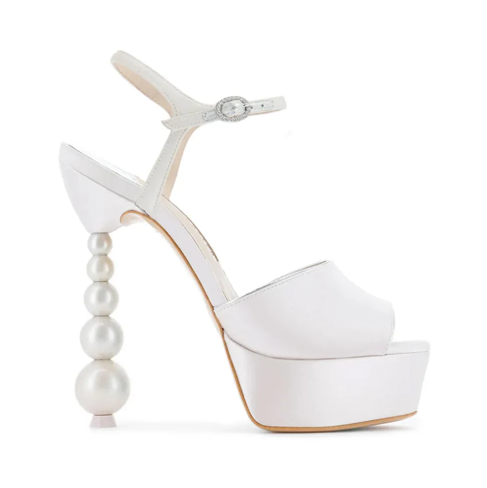 London-based Sophia Webster burst onto the scene in 2013, instantly renowned for her uniquely uplifting designs.With a background in fine art, and an eye for quality, inclusivity and sustainability, she creates footwear and accessories that embrace both an incredible fantasy and a gorgeous reality. A romantic sandal, it’s hard not to fall for the Natalia Perla Sandal in Ivory & Pearl, which arrives in a soft Ivory satin with a pearl heal. We love the platform sandal’s open-toe, with a crystal buckle and gradient beaded heel.