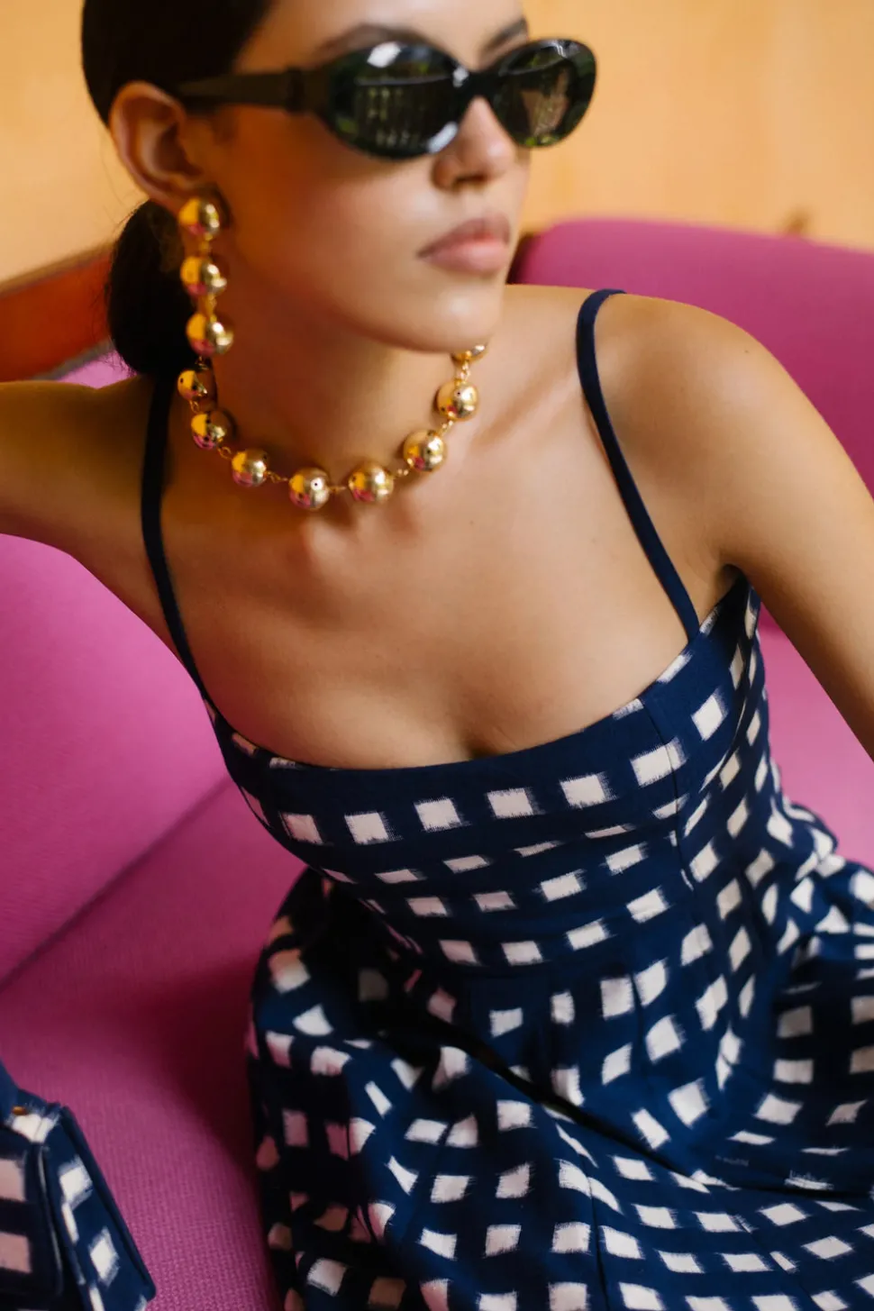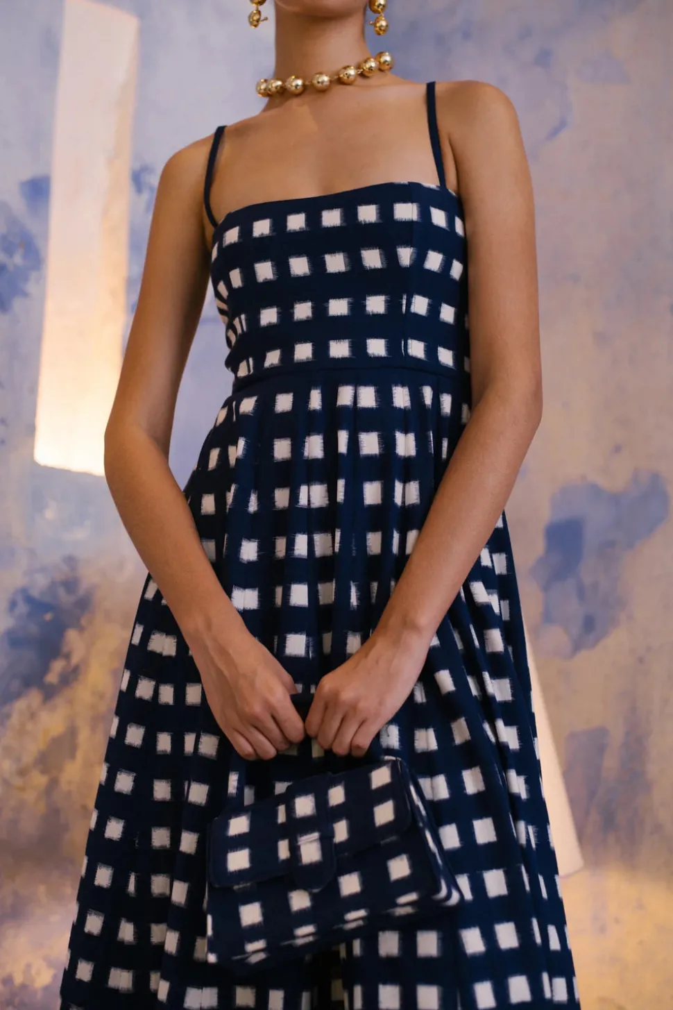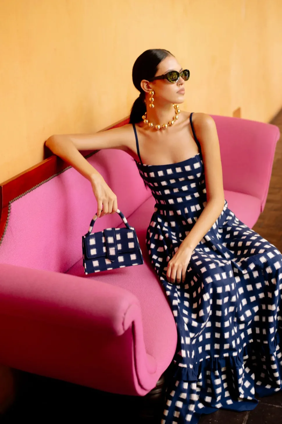 De Castro showcases a seamless and unique blend of traditional Indian craftsmanship, contemporary design, and the founder’s Colombian heritage. Every piece is handmade by artisans, using time-honored techniques and the finest cotton and silk fibers, resulting in exceptional quality, sustainability, and style. Boasting a full length, cinched waist, and corset bodice, what makes the Checkmate Dress stand out is its navy and white hand-loomed ikat pattern. We also love the tiered detail, for a touch of romance.