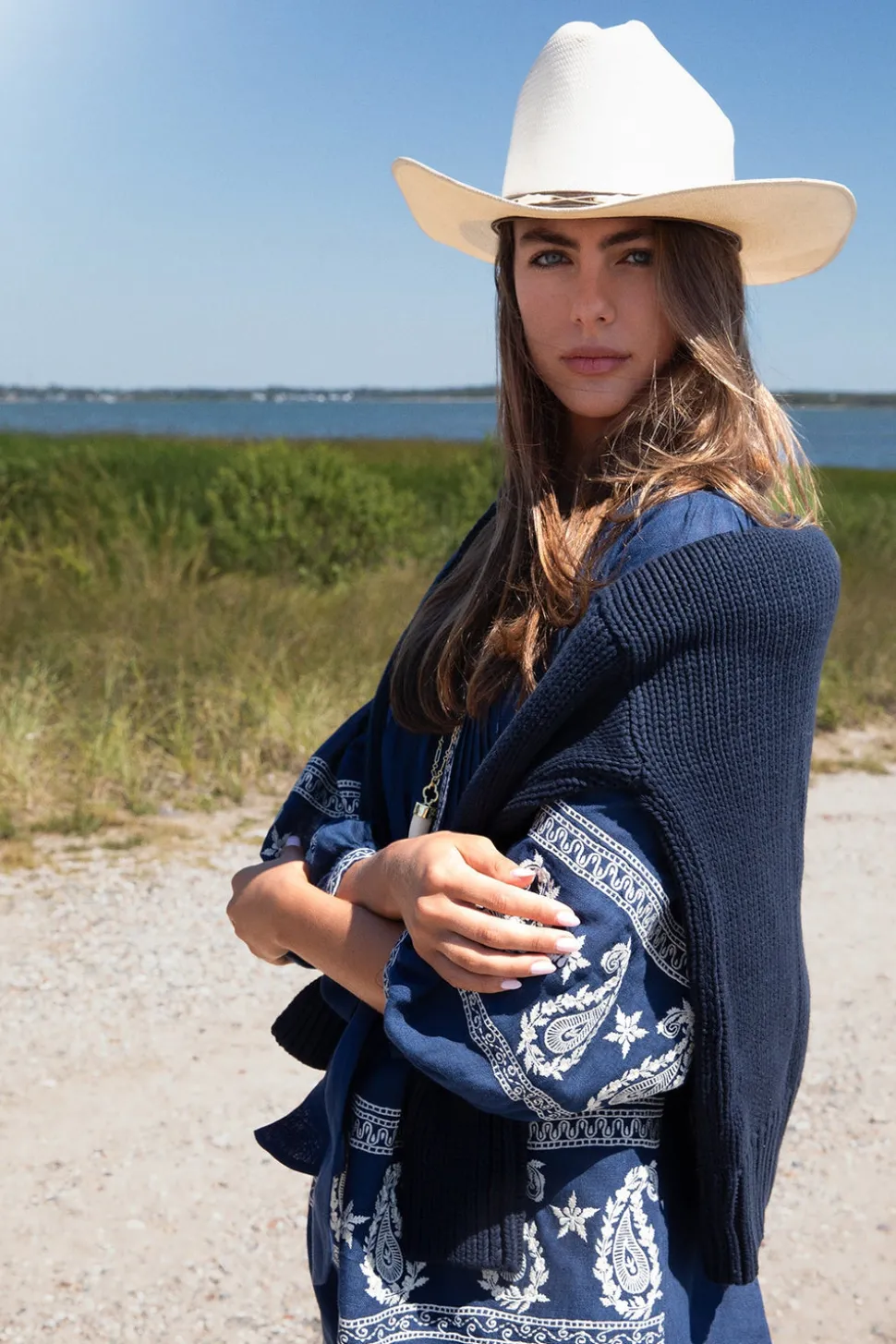 Inspired by art, architecture, and the founder’s global journeys, ASHA by Ashley McCormick introduces bold, sophisticated jewelry and accessories made from only the finest materials. From everyday glamour to the red carpet, these statement pieces are classic additions to your collection. The Navy Piper Dress embraces the season in navy linen, its gauzy weave embroidered with ivory bohemian paisleys across the sleeves, hem, and waist. Billowing sleeves, a tie waist, and a sweeping skirt create a silhouette that balances effortless ease with statement detail—ideal for crisp autumn days.