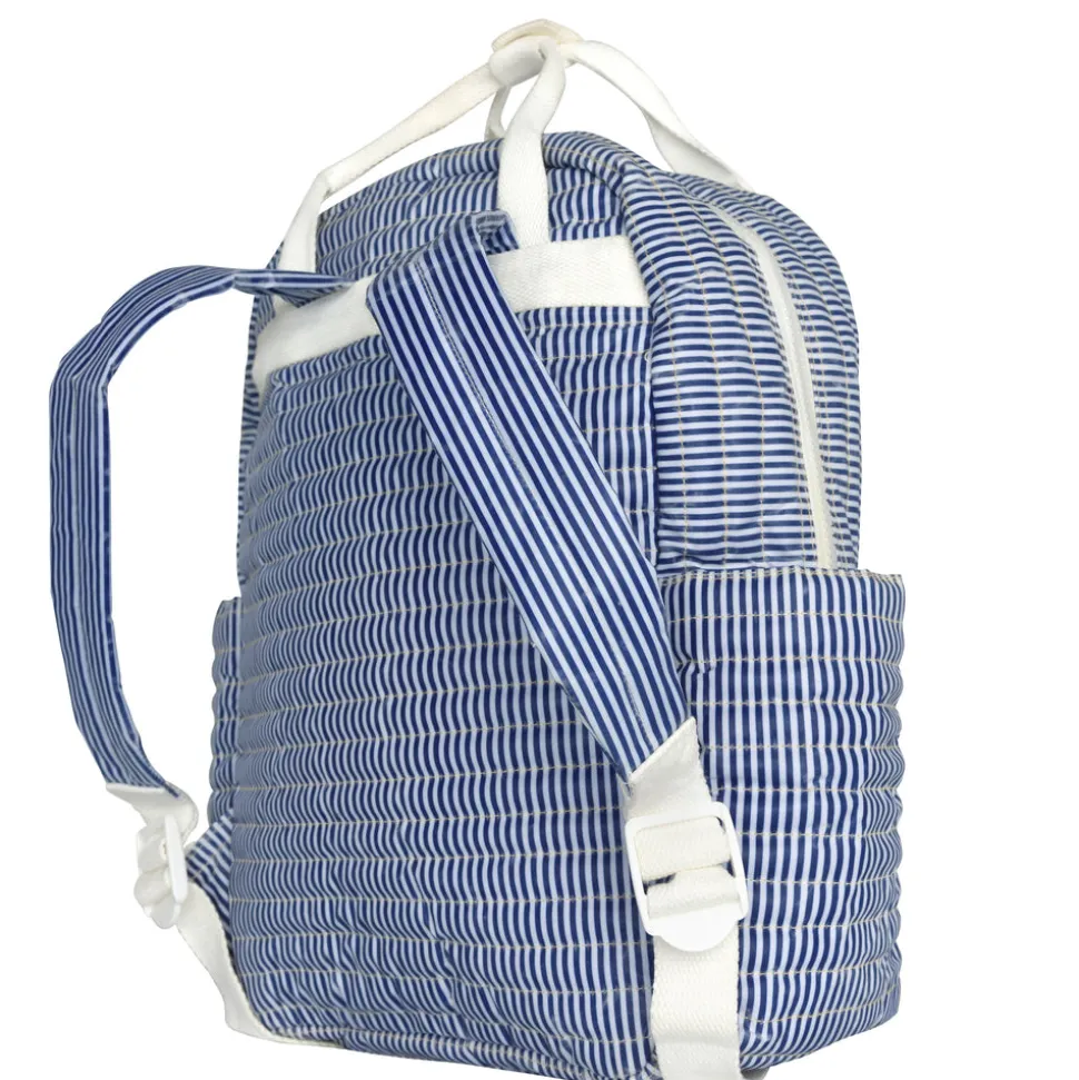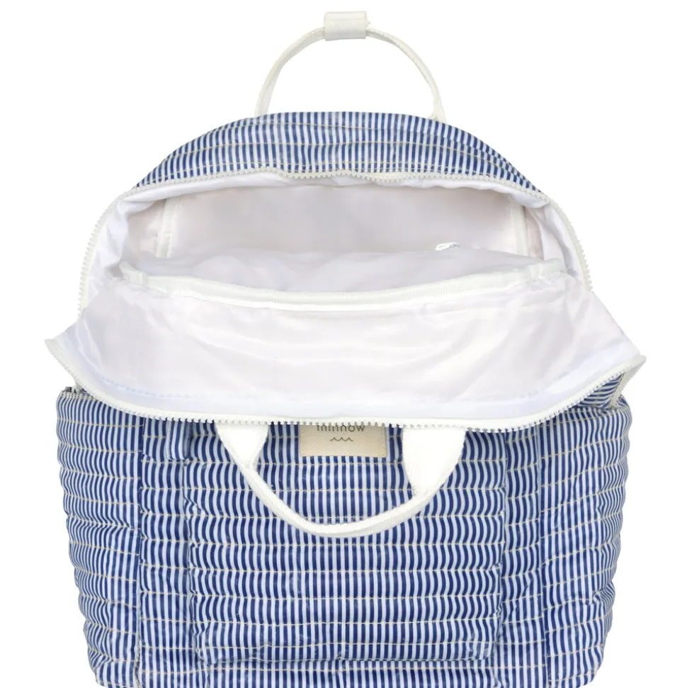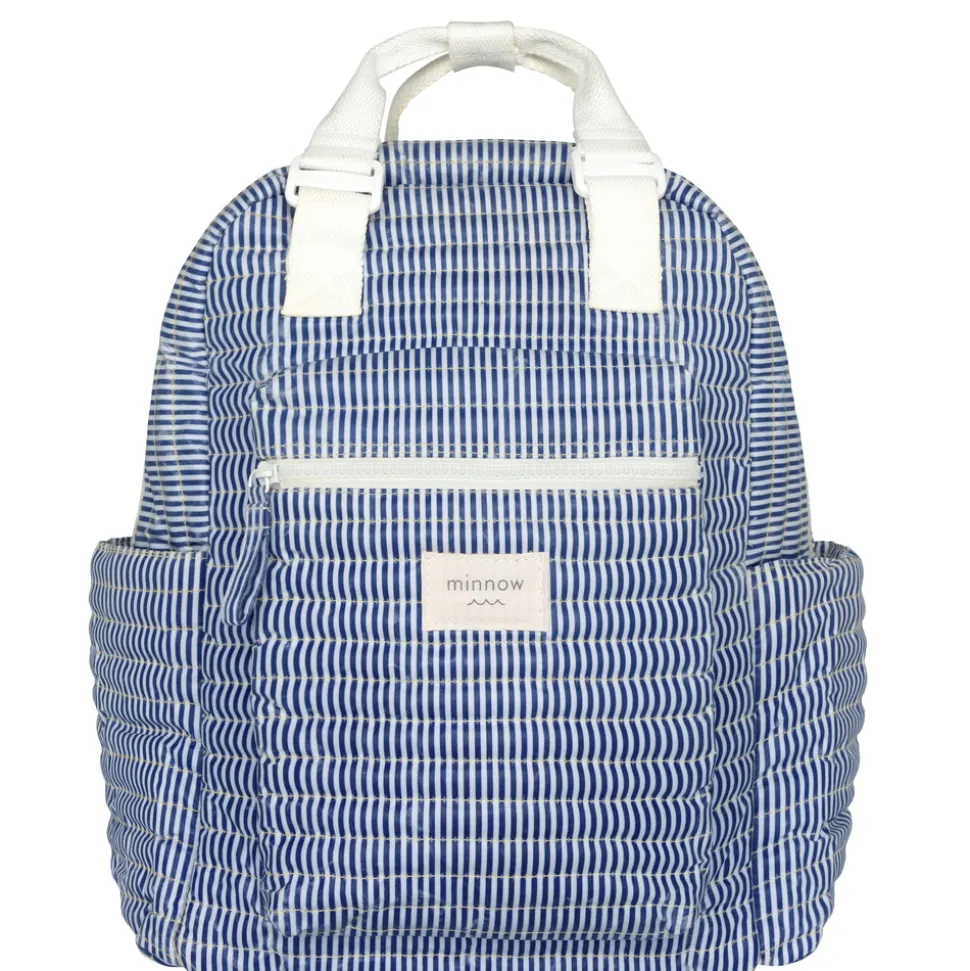 A family favorite for its clean lines and simple details, minnow creates pieces that are playful, polished, and thoughtfully designed for long days, sandy toes, and the wonderment of life on the shore. The Navy Stripe Coated Backpack is soft, quilted, and made with on-the-go lifestyles in mind. Ideal for everything from travel to the beach to school, this bag is thoughtfully designed with padded shoulder straps, convenient top-carry handles, two side pockets and a zippered front pocket, a lined interior, and a spill-proof coated exterior.