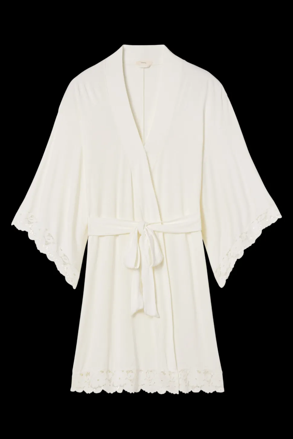 Body: 95% TENCEL modal, 5% spandex. Lace: 91% nylon, 9% spandex. Biodegradable and responsibly sourced from renewable raw beech tree pulp. Short kimono sleeve robe. Wrap style with attached adjustable sash. Lace detail at sleeves and hem.