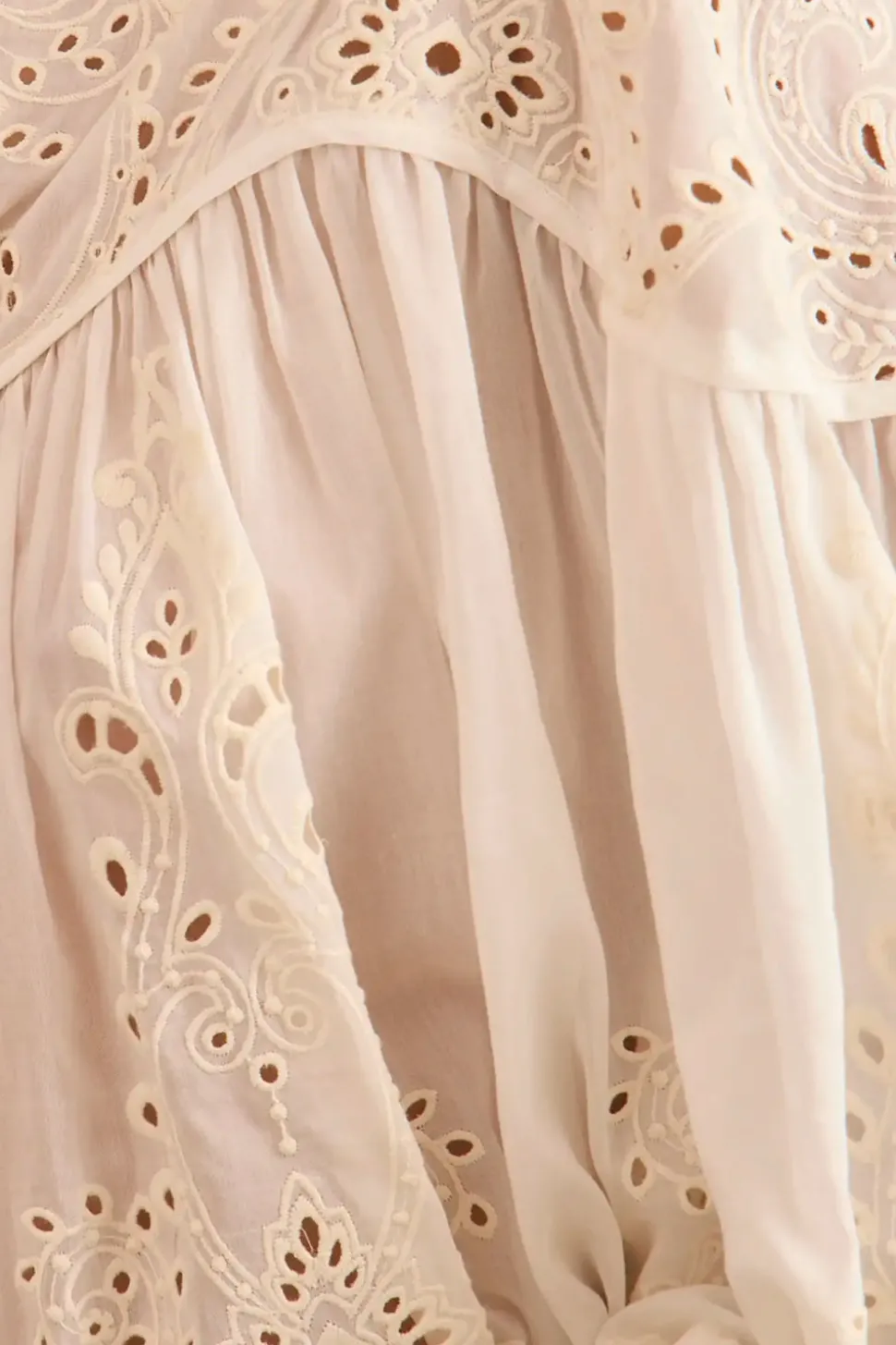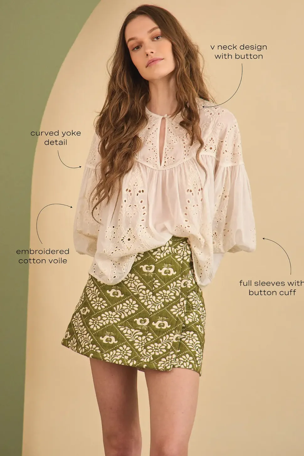 100% cotton. Embroidered cotton voile. V-neckline. Curved yoke. Full sleeves with buttoned cuffs. Relaxed silhouette. 24″ length from top of shoulder.