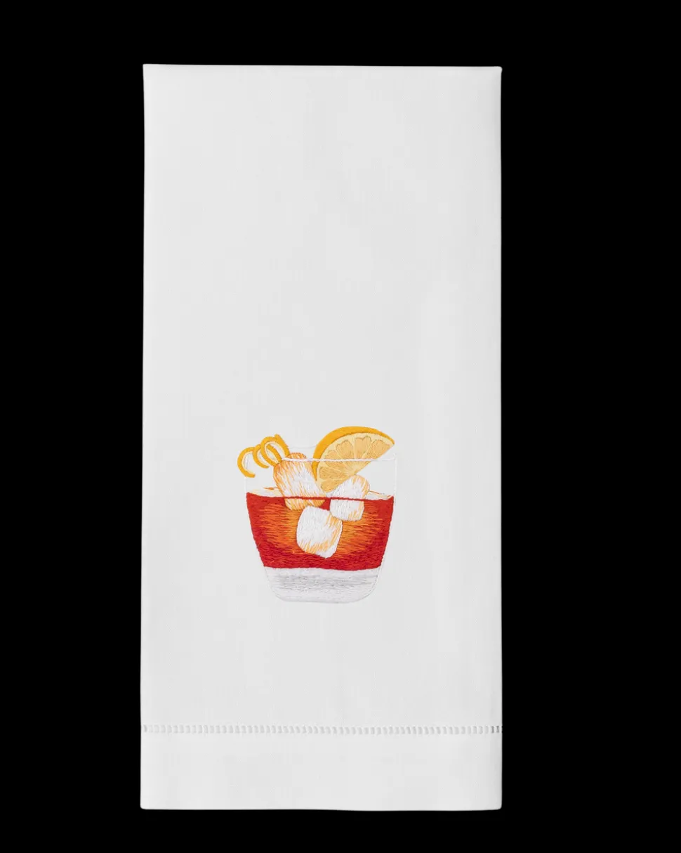 Founded in 2012, Henry Handwork brings joy to the everyday with handmade textiles for the home. Placing tradition and quality at the forefront, the brand resurrects the fading craft of hand-embroidery and needlework, embracing the heritage of finely-wrought European linens. The Negroni Cocktail Hand Towel is a white, hand-embroidered piece that is finished and hemstitched by hand that will add classic clubhouse charm to any home.
