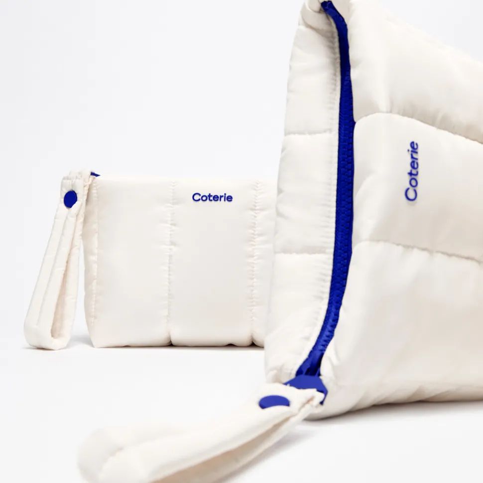 The Diaper and The Wipe are hypoallergenic, dermatologist tested, cruelty free, and made with no added fragrance, lotion, latex, rubber, dyes, alcohol, heavy metals, parabens, phthalates, pesticides, chlorine bleaching, VOCs, or optical brighteners. The Diaper is made with a 25% plant-based core; The Wipe is made of 100% plant-based fibers and a gentle, 99% purified water cleansing formula. Note: Packaging may differ from photos, but product descriptions are accurate. The Pouch is ultra-light, water-resistant, and made from recycled bottles. It’s perfect for carrying a day’s worth of diapers and travel wipes with room for a bottle or toys; a zippered interior pocket keeps keys or cards organized. It has an off-white exterior and interior lining with blue zipper details.
