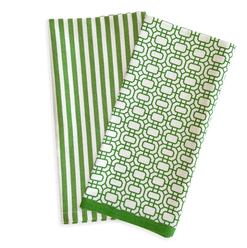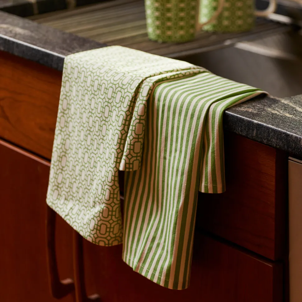 Caskata makes dinnerware for those who love to entertain. That joie de vivre and celebratory atmosphere makes its way into each piece of the brand’s blend of classic and contemporary designs, recognizable by their creative patterns, enduring quality, and light touch. The Newport Garden Gate & Pinstripe Verde Kitchen Towels, Mixed Set of 2 features an interlocking lattice pattern in saturated color that adds a clean, contemporary note to any kitchen. This set of two 100% cotton everyday kitchen towels are pretty, yes, but strong enough to handle anything you’re dishing up. You’ll love how they get softer with each trip to the washing machine.