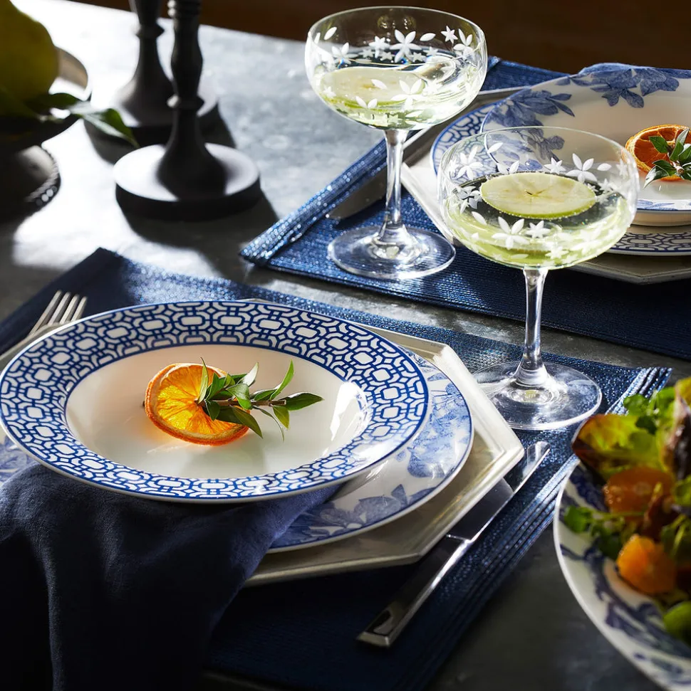 Caskata makes dinnerware for those who love to entertain. That joie de vivre and celebratory atmosphere makes its way into each piece of the brand’s blend of classic and contemporary designs, recognizable by their creative patterns, enduring quality, and light touch. The Newport collection offers clean geometric shapes—each in a different pattern—on creamy white premium porcelain, layering effortlessly with any tabletop. The Newport Garden Gate Rimmed Soup Bowl provides a sophisticated conduit for soups, salads, stews, pastas and more.